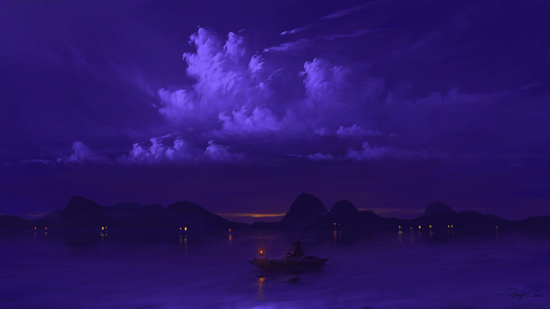 A Stunning Digital Art, Night, Sky, Water, Boat Full HD Desktop and Mobile Wallpaper Background (1920x1080)