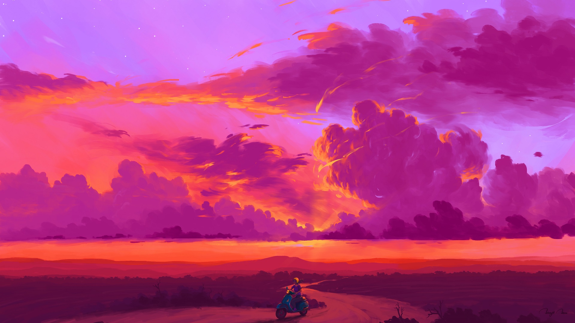 Digital Painting, Landscape, Sky, Clouds, Biker Full HD Desktop Wallpaper