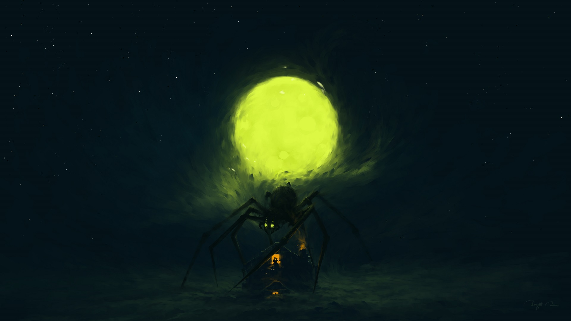 Digital Painting, Night, Moon, Horror, Arachnid Full HD Desktop and Mobile Wallpaper Background with a maximum resolution of 1920x1080 px.
