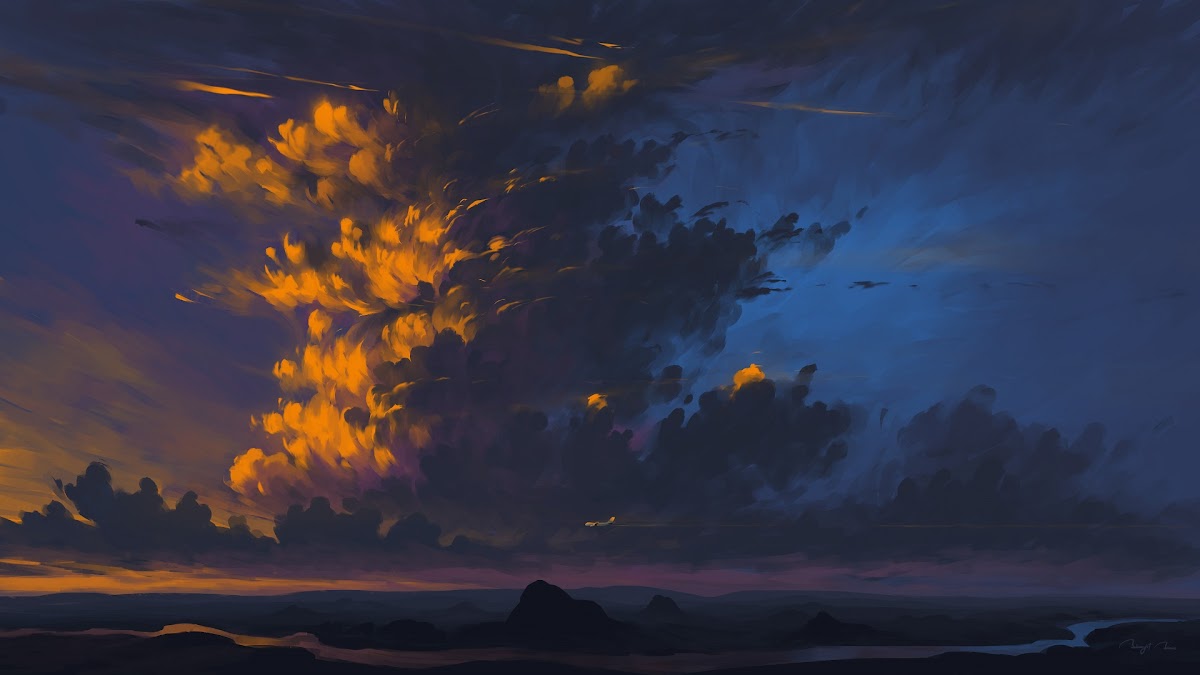 Digital Painting, Sky, Clouds, Aircraft, Landscape Full HD Desktop and Mobile Wallpaper Background with a maximum resolution of 1920x1080 px.