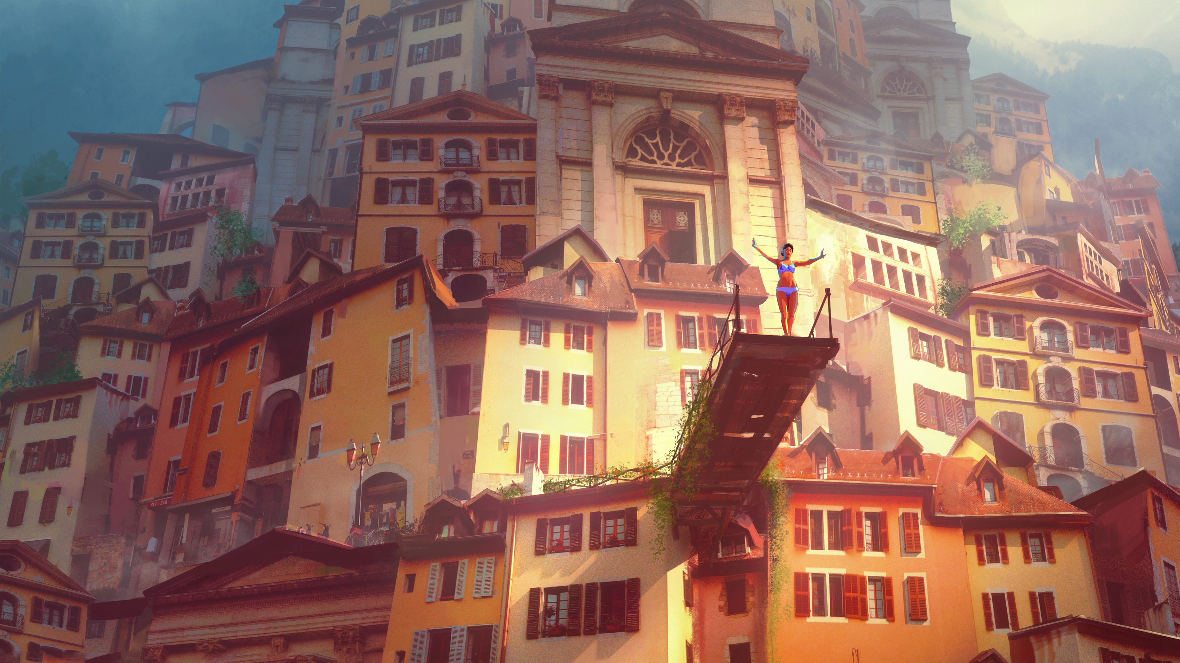 Marc Simonetti, Sunlight, Building, Vintage, Digital Art 4K Desktop Wallpaper