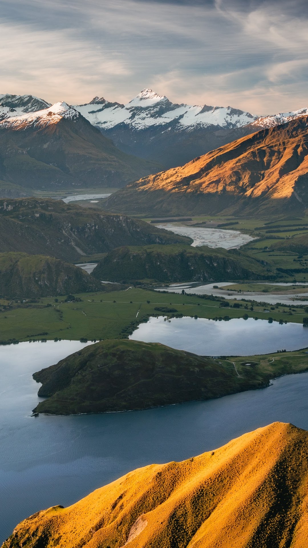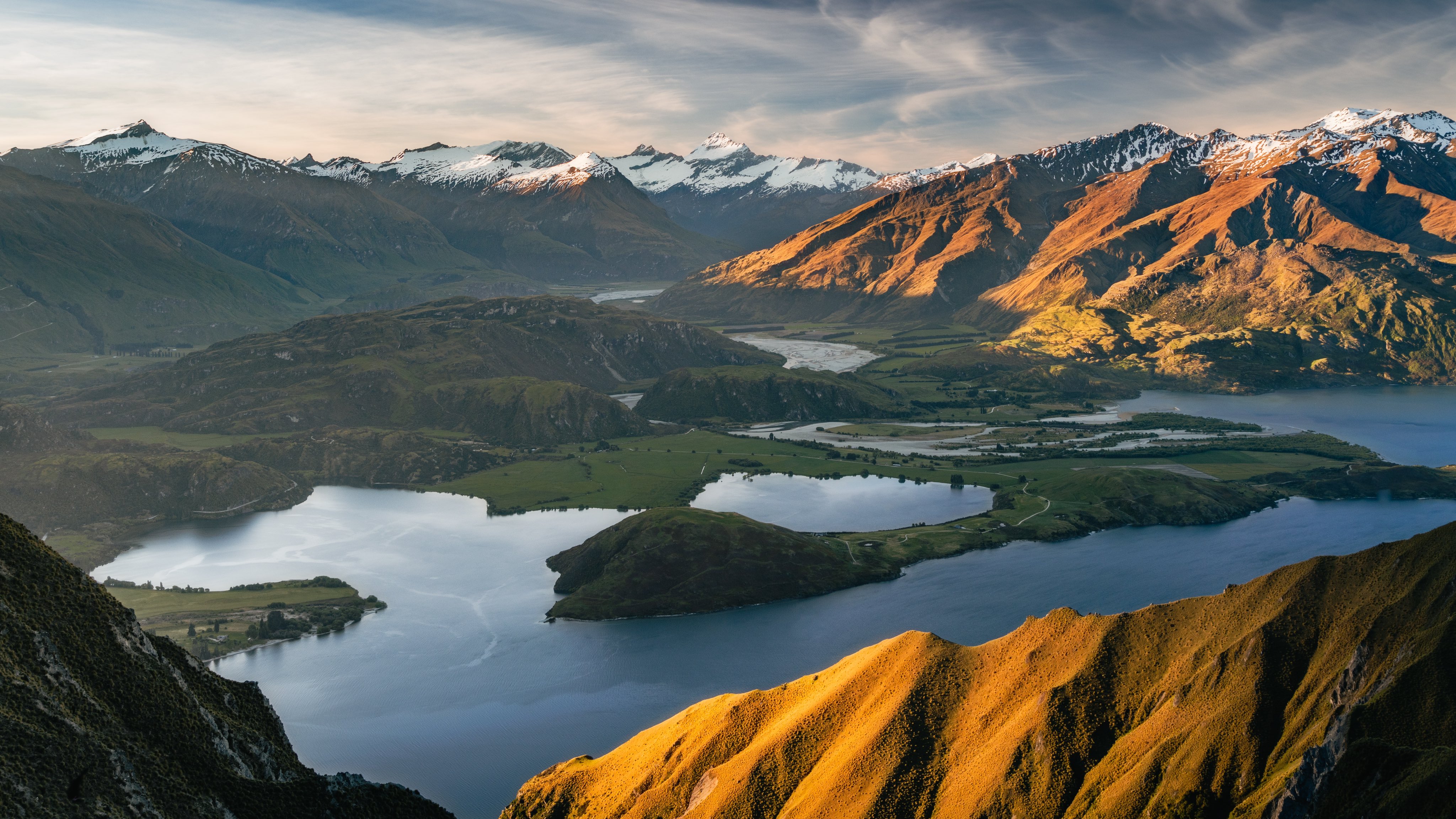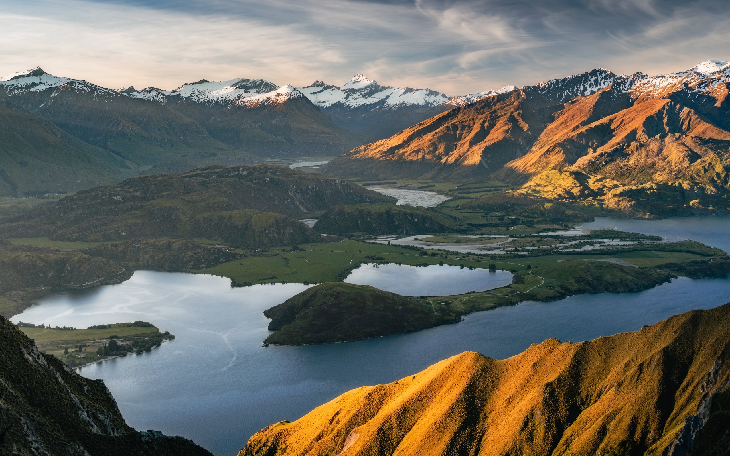 Mountains, Landscape, Snowy Mountain, Lake, Sunset 4K Desktop and Mobile Wallpaper Background with a maximum resolution of 4096x2304 px.