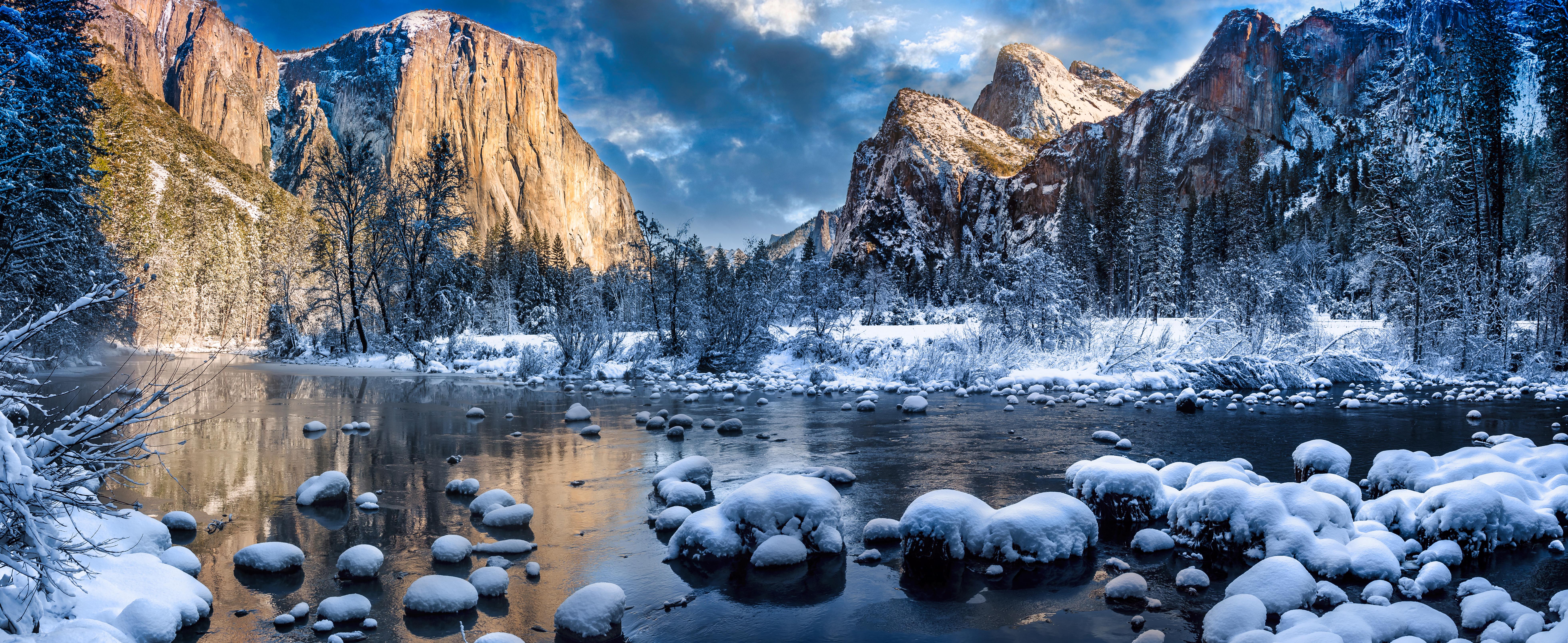 Yosemite National Park, California, Usa, Winter, River 5K Desktop and Mobile Wallpaper Background with a maximum resolution of 7846x3219 px.