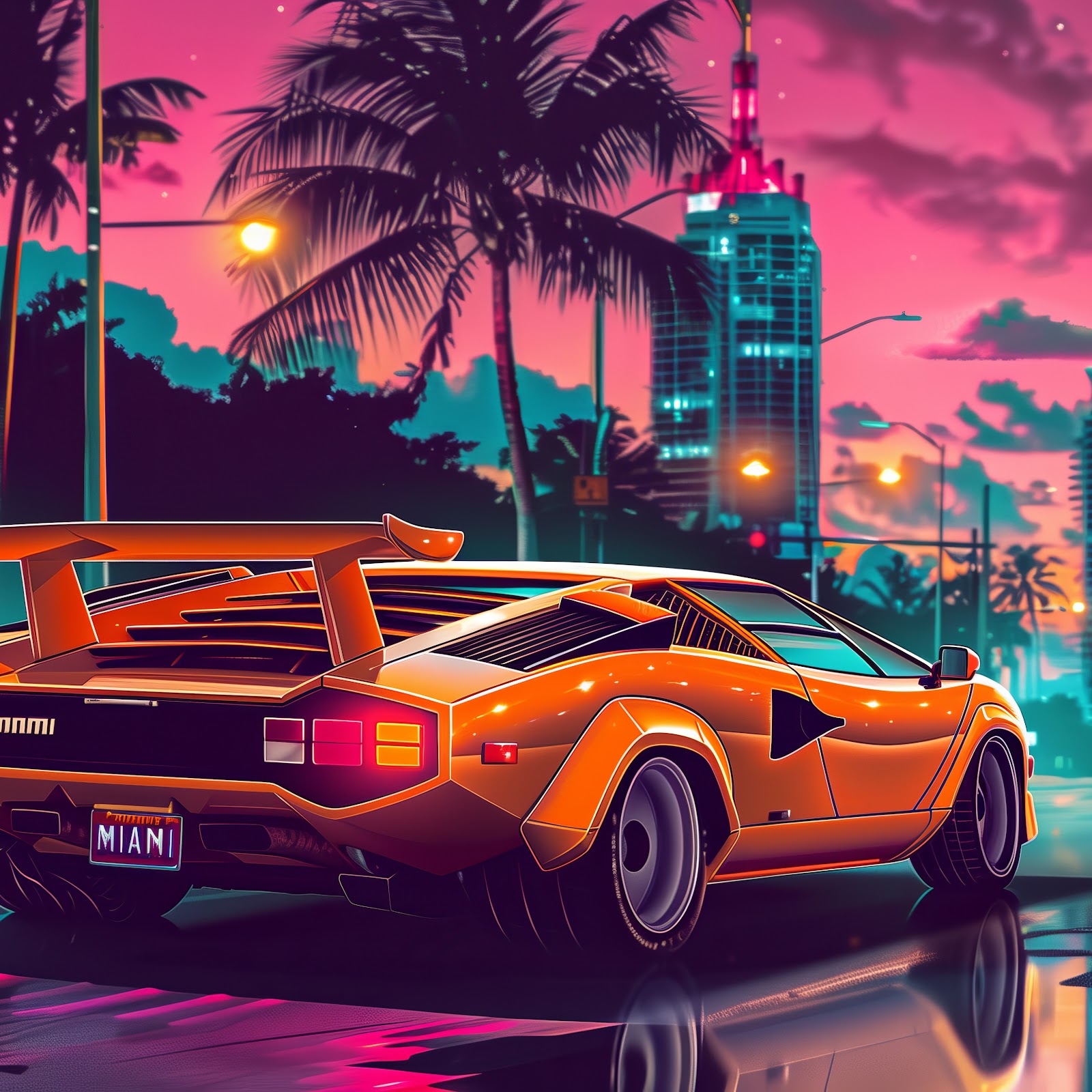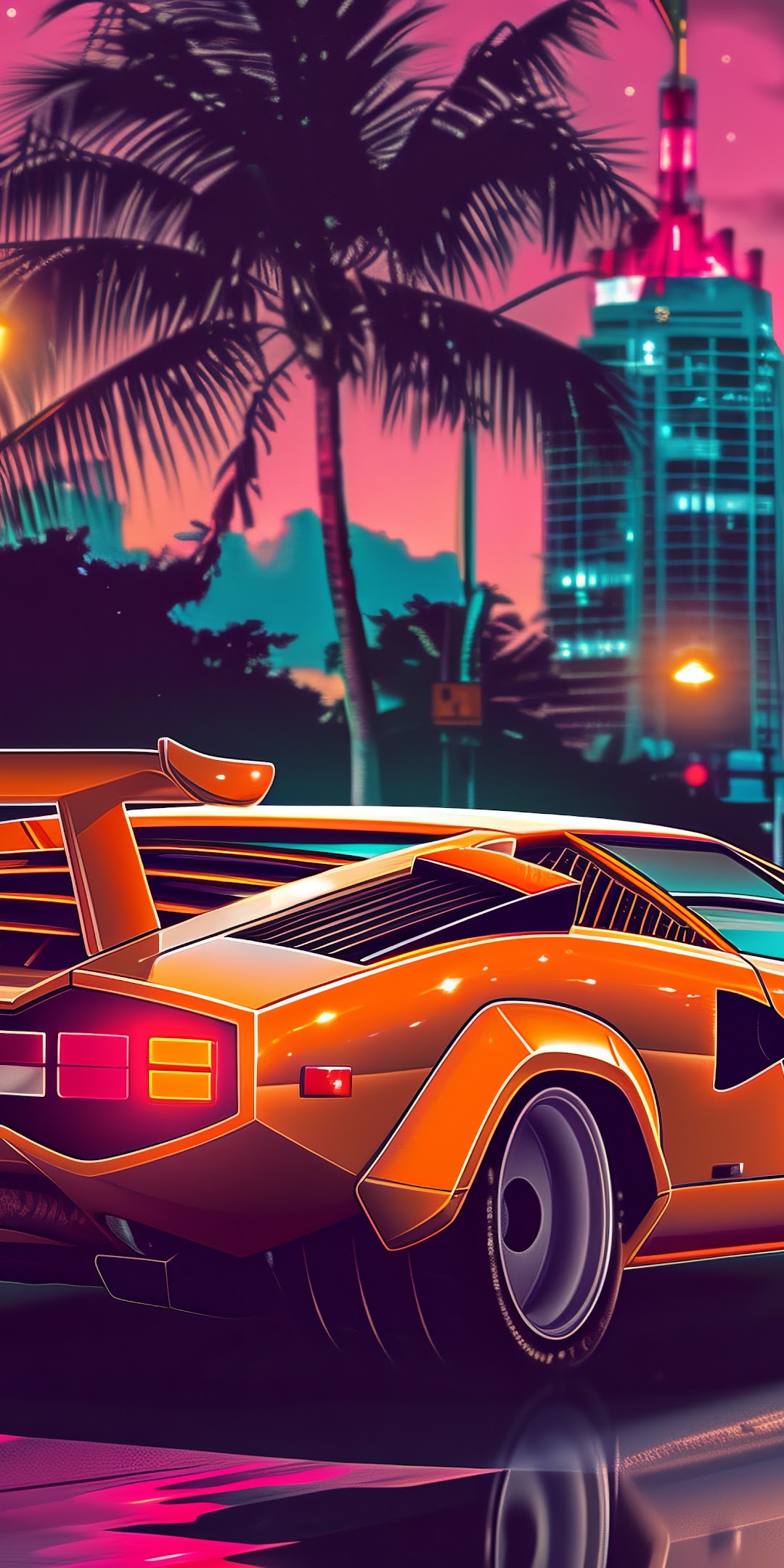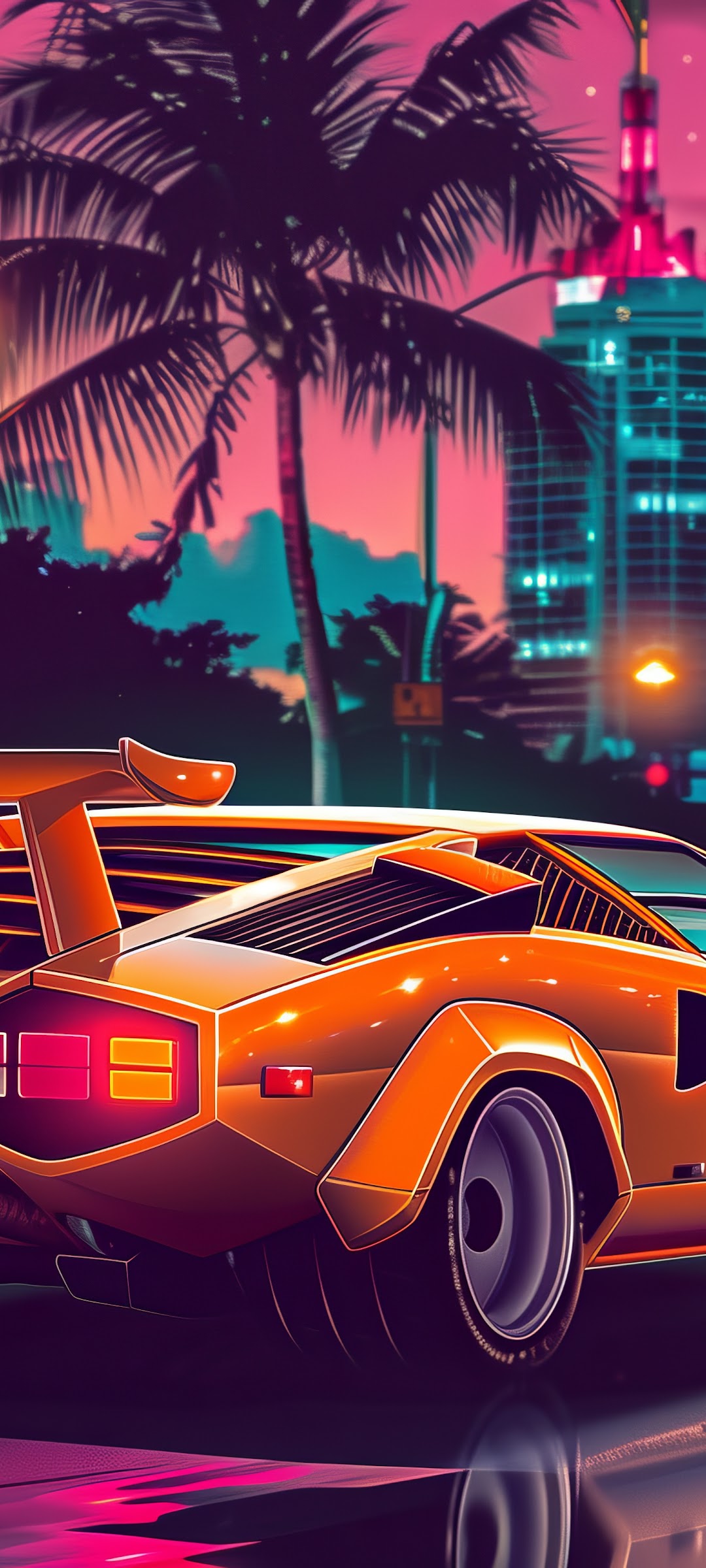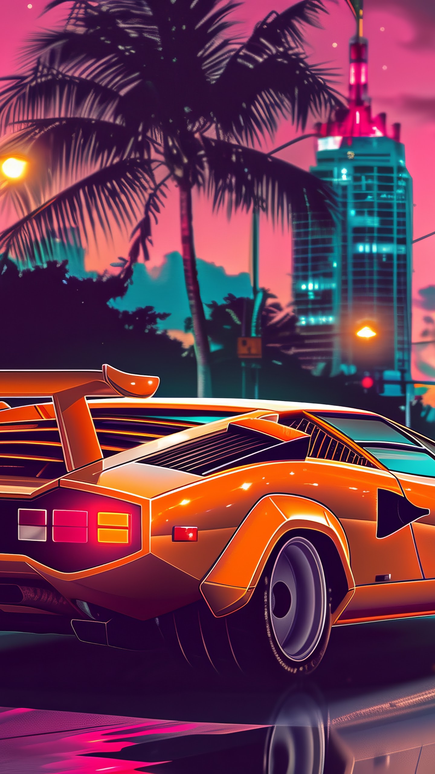 A Stunning Ai Art, Illustration, Lamborghini Countach, Palm Trees, Synthwave 5K Desktop and Mobile Wallpaper Background (5824x3264)