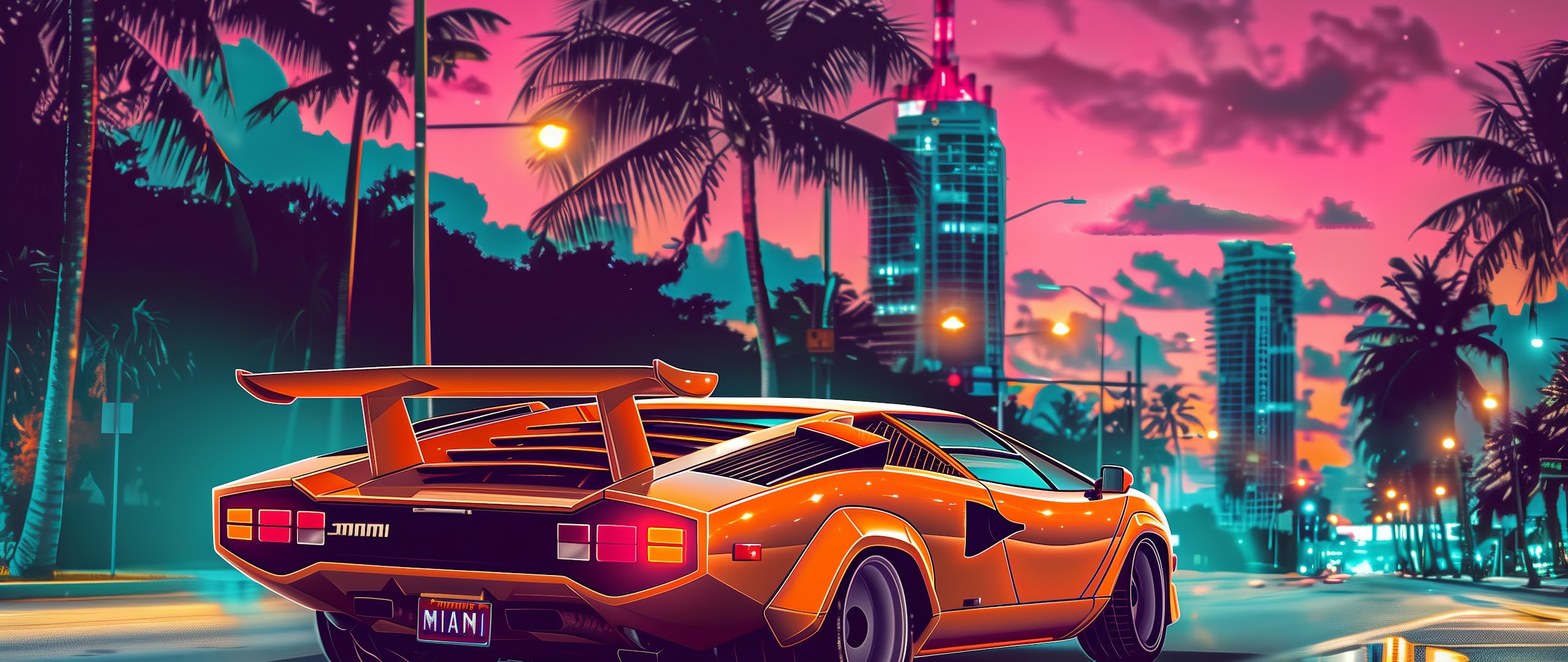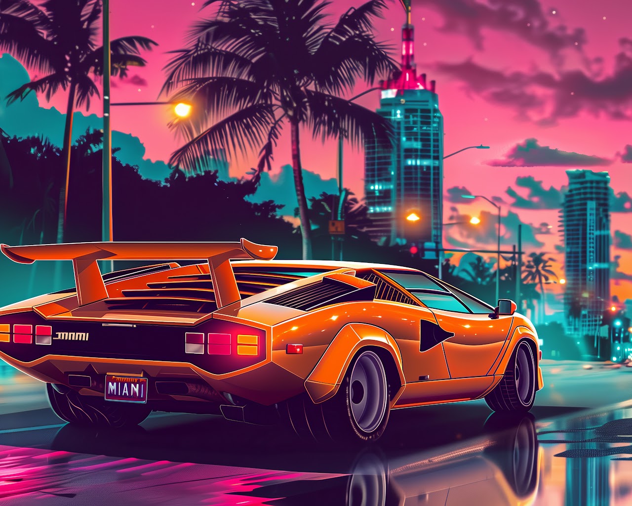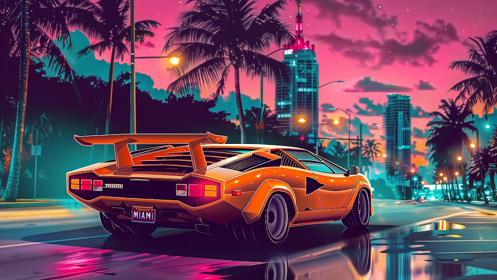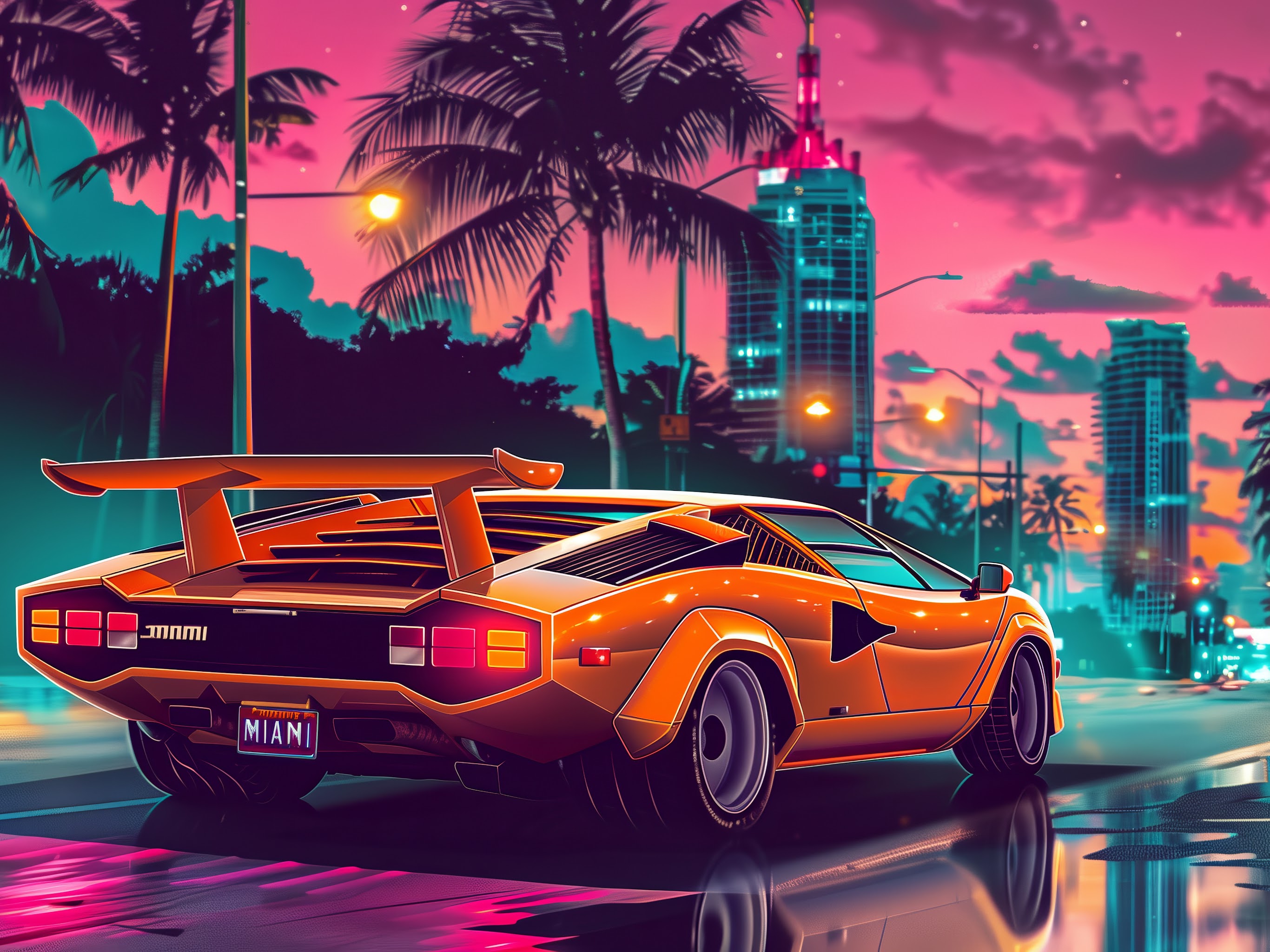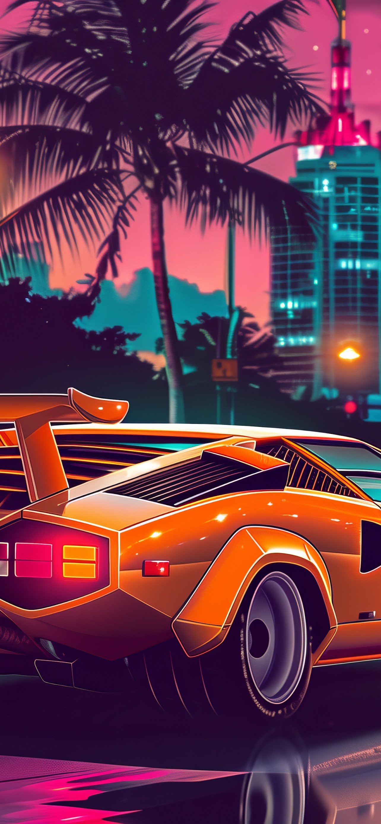 A Stunning Ai Art, Illustration, Lamborghini Countach, Palm Trees, Synthwave 5K Desktop and Mobile Wallpaper Background (5824x3264)