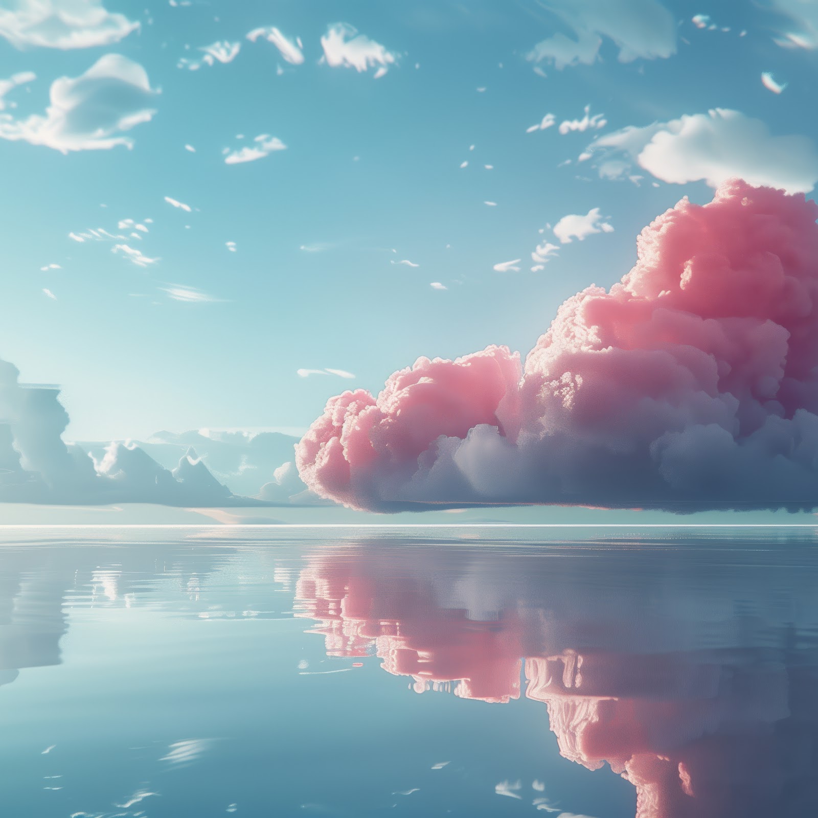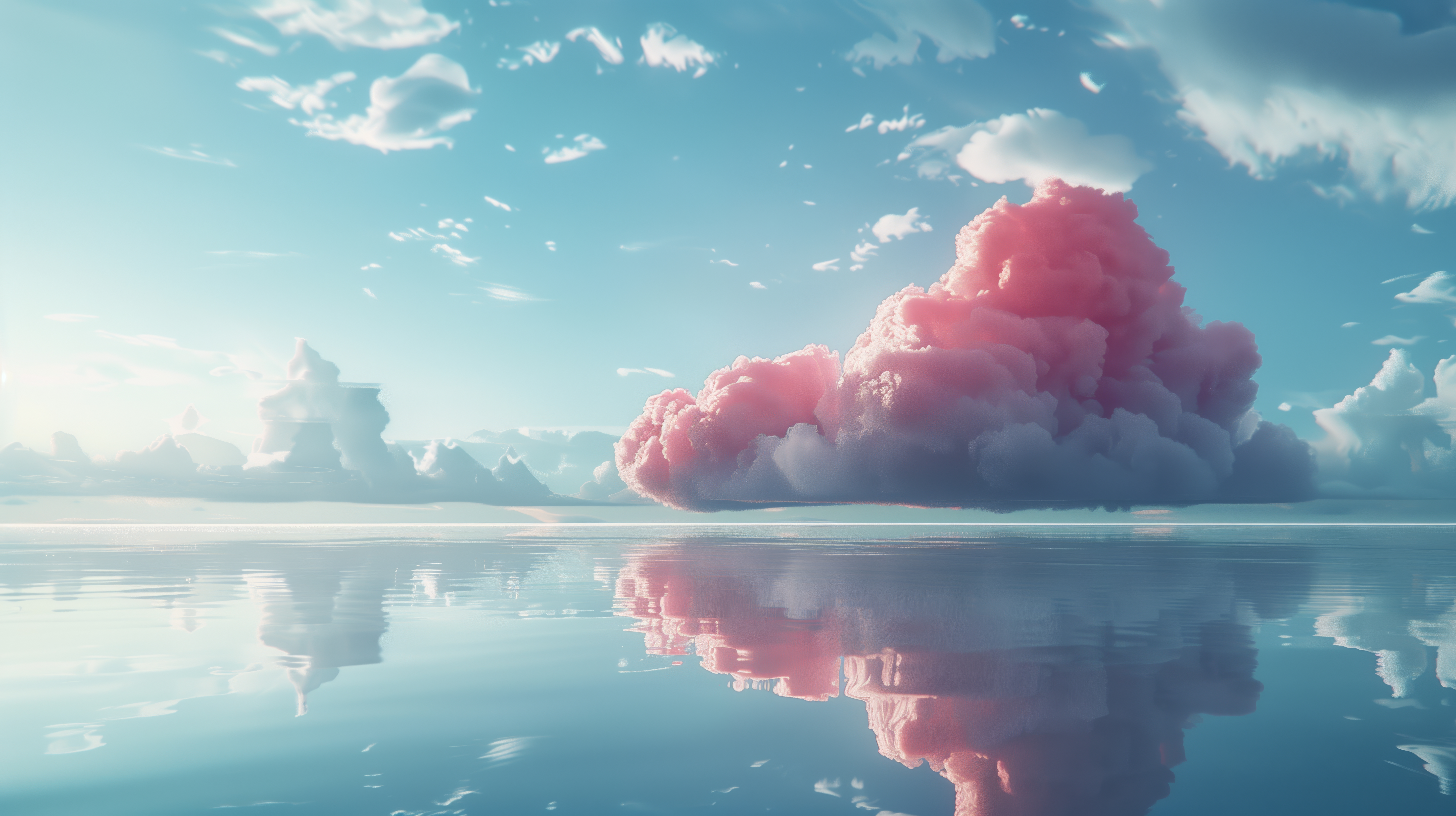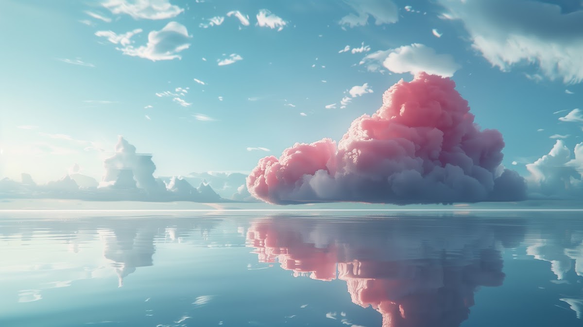 Ai Art, Pink Clouds, Reflection, Pastel 5K Desktop and Mobile Wallpaper Background with a maximum resolution of 5824x3264 px.