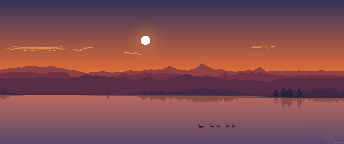 Lake, Sunset, Minimalism, Flat Art, Mountains 10K Desktop and Mobile Wallpaper Background with a maximum resolution of 10750x4500 px.