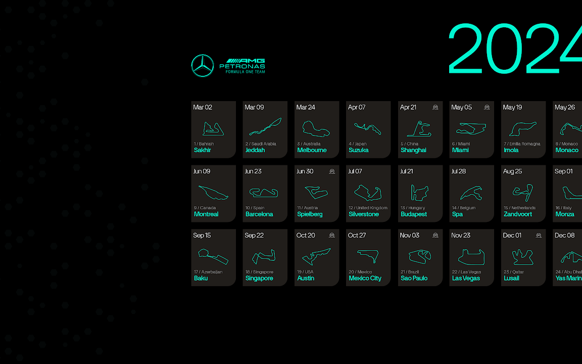 Mercedes F1, Map, Formula 1, Calendar, Simple Background 4K Desktop and Mobile Wallpaper Background with a maximum resolution of 3840x2160 px.