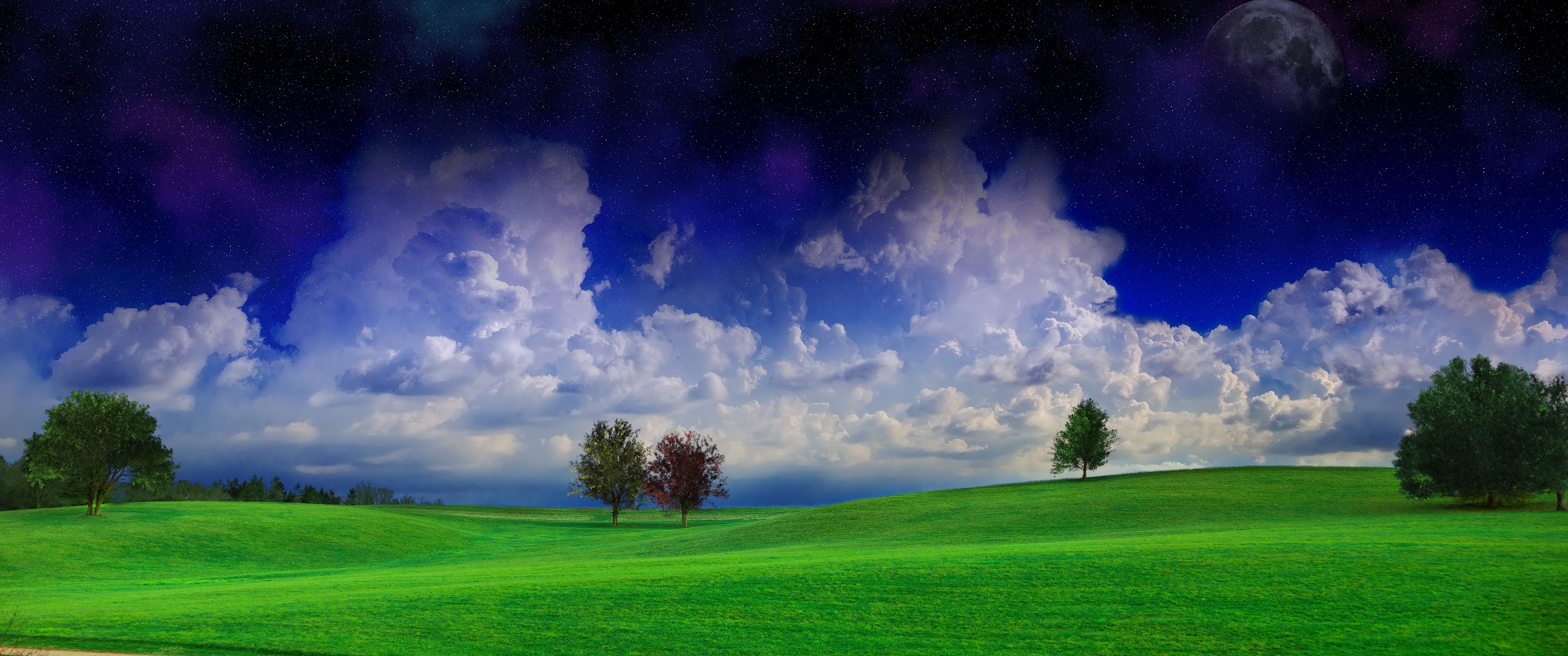 Digital Art, Trees, Grass, Green, Clouds 4K Desktop and Mobile Wallpaper Background with a maximum resolution of 3840x2160 px.