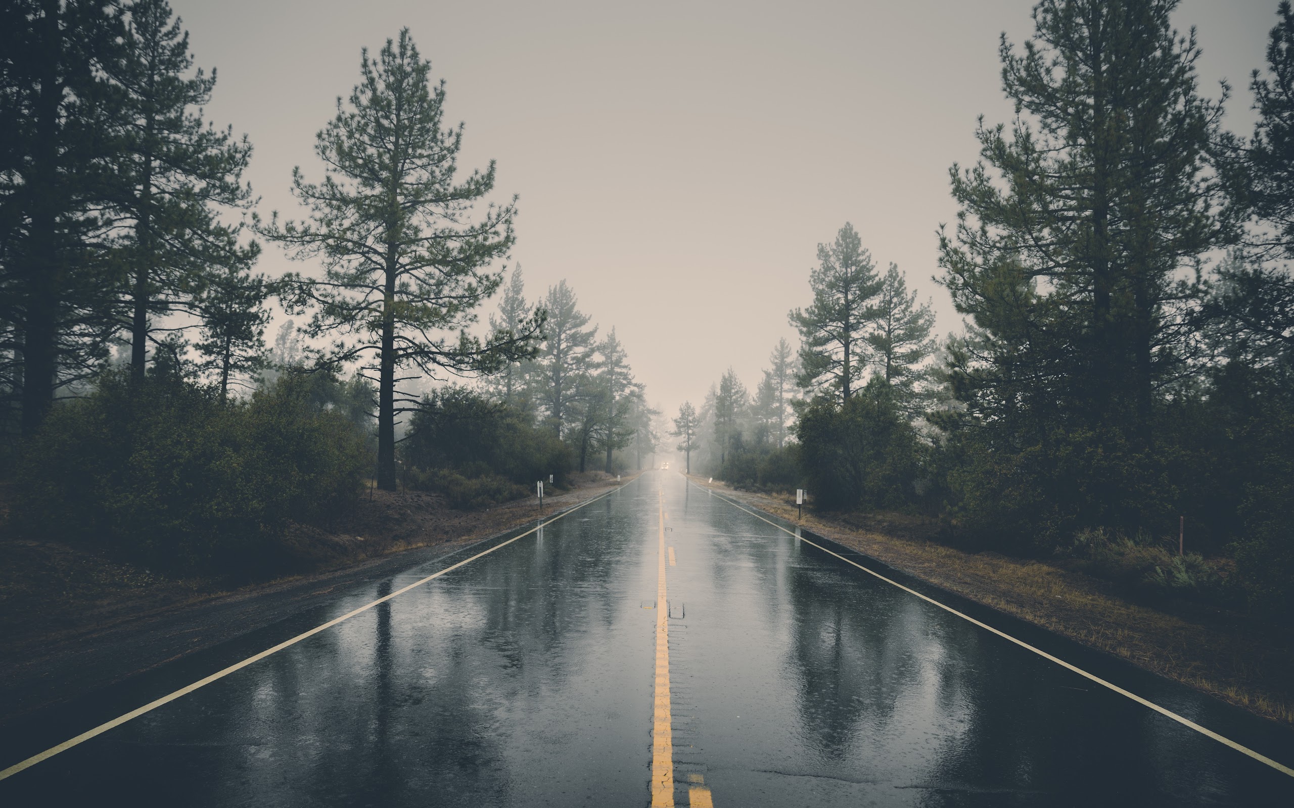 Road, Trees, Rain, Fog, Asphalt 8K Desktop and Mobile Wallpaper Background with a maximum resolution of 7718x5148 px.