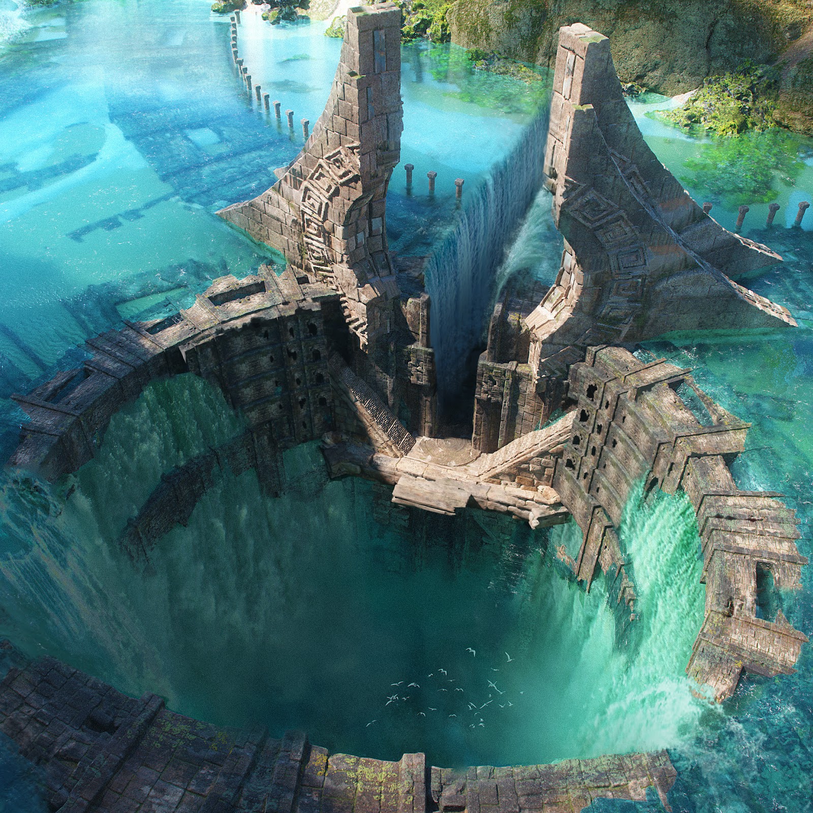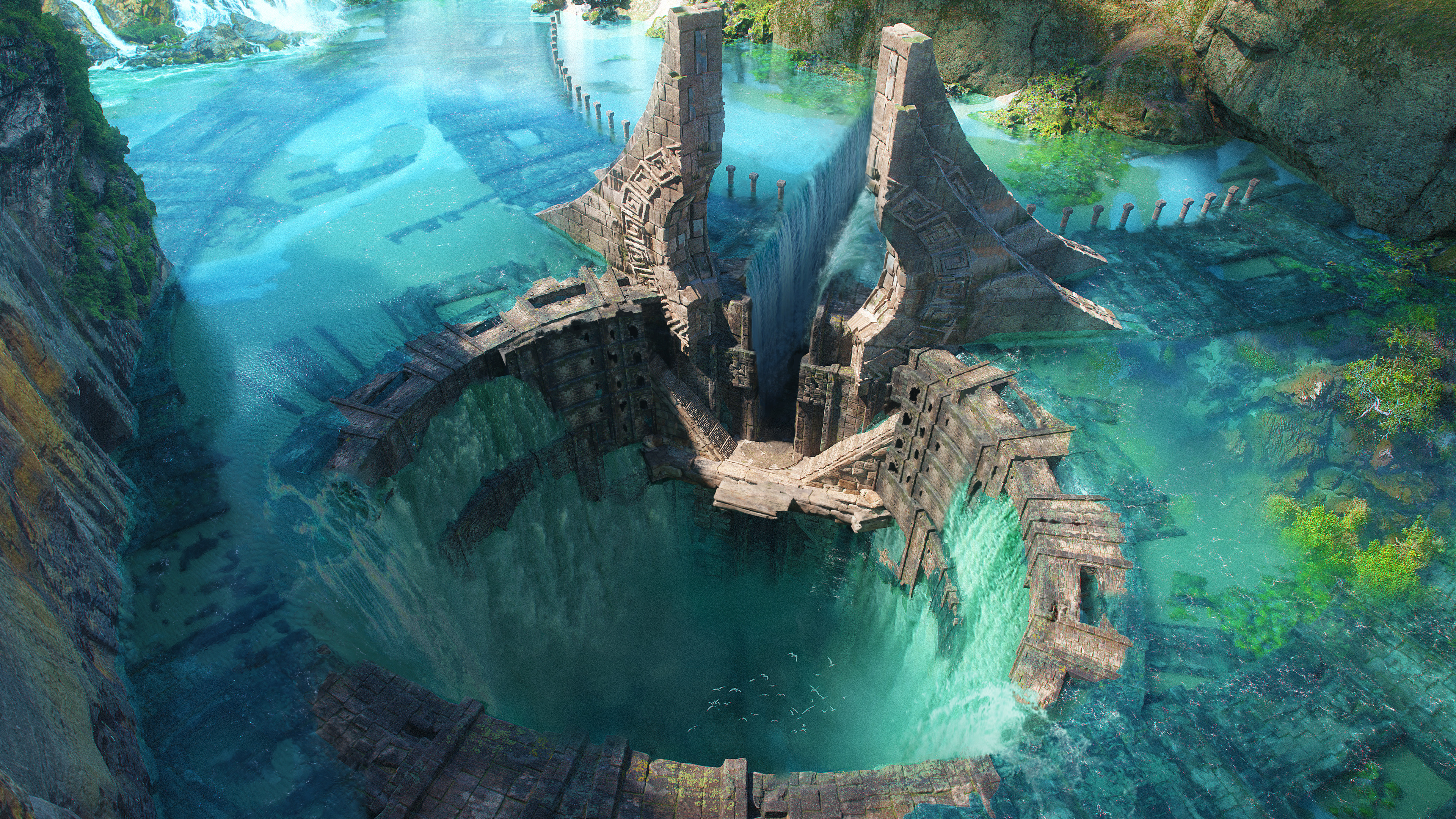 Fantasy, Ruins, Water, Temple 4K Desktop and Mobile Wallpaper Background with a maximum resolution of 3840x2160 px.