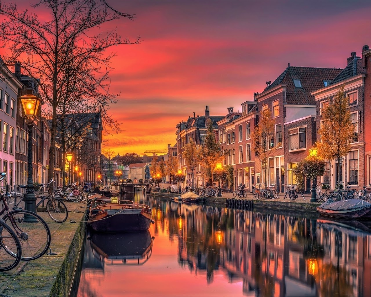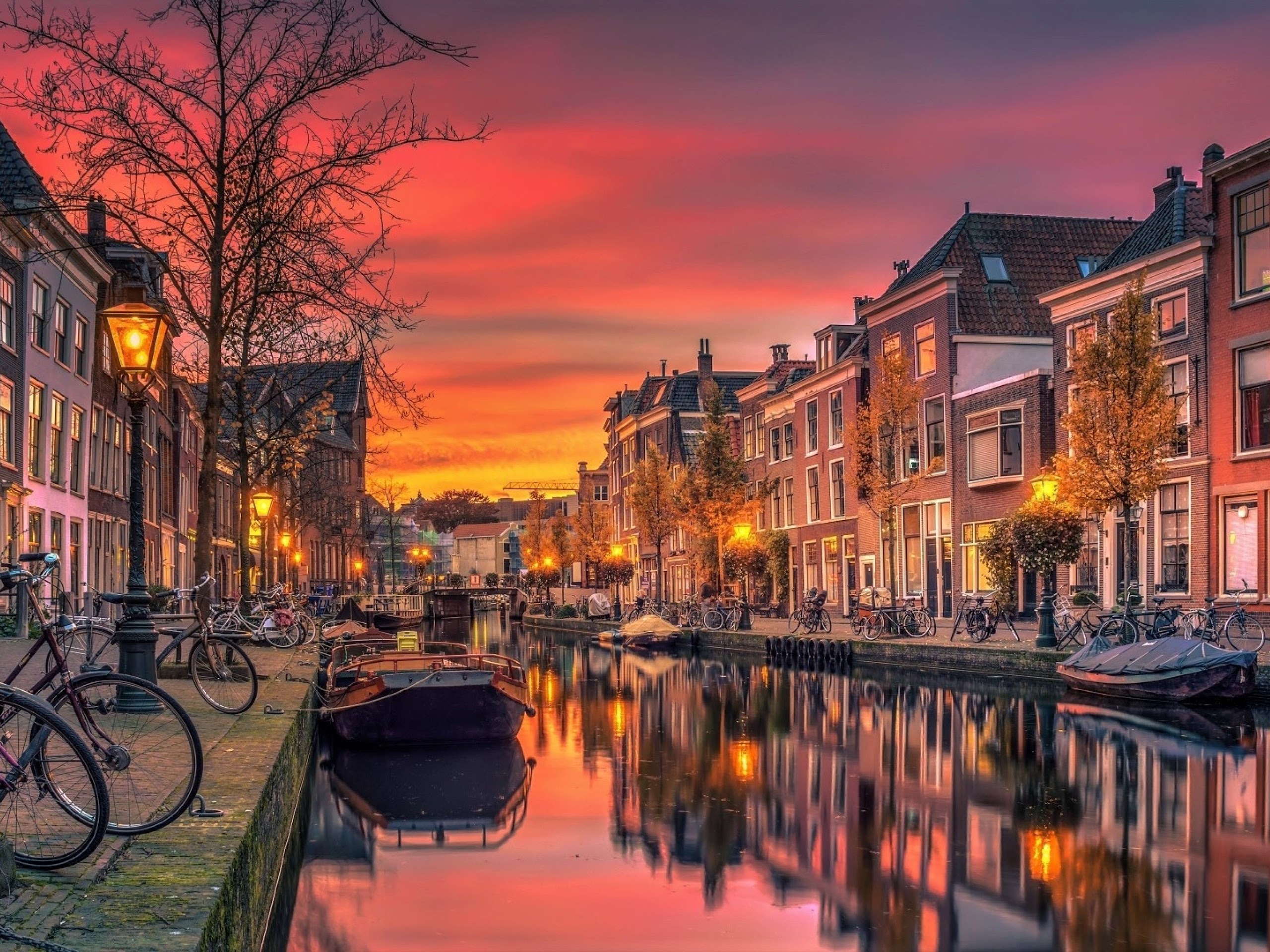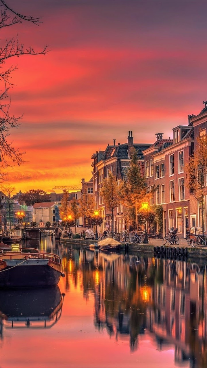Netherlands, Canal, Cityscape, Sunset 4K Desktop and Mobile Wallpaper Background with a maximum resolution of 3840x2160 px.