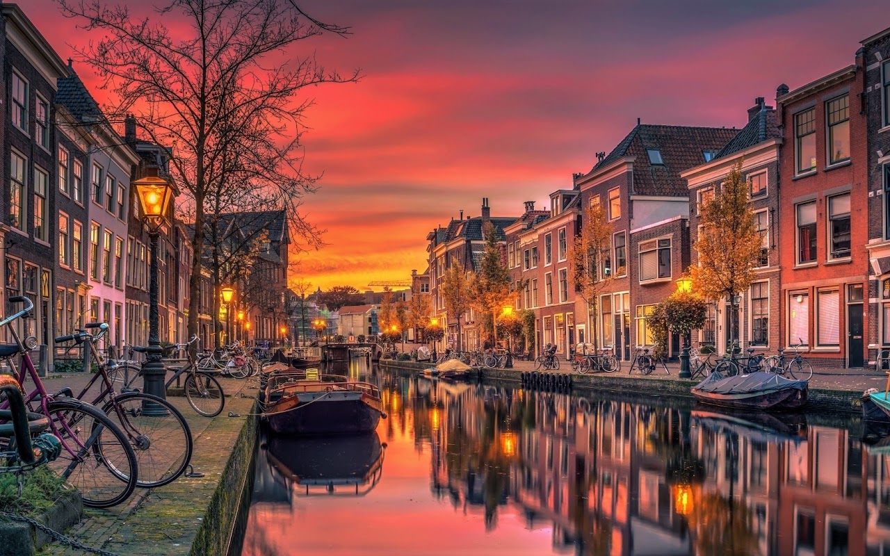 Netherlands, Canal, Cityscape, Sunset 4K Desktop Wallpaper