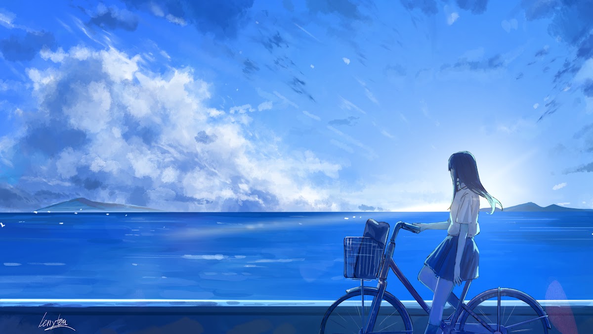 Anime, Seascape, Bicycle, Girl 4K Desktop and Mobile Wallpaper Background with a maximum resolution of 3840x2160 px.