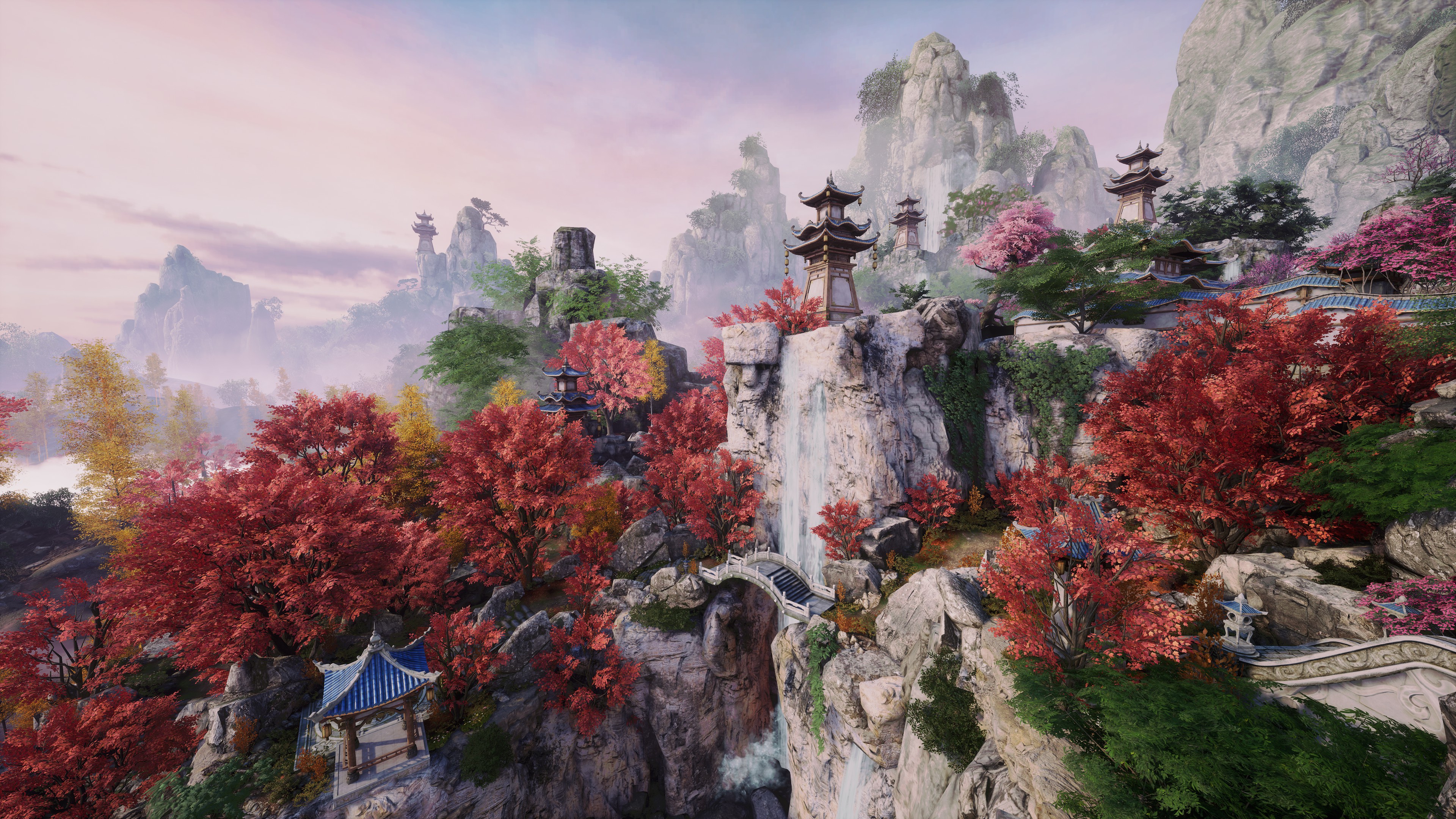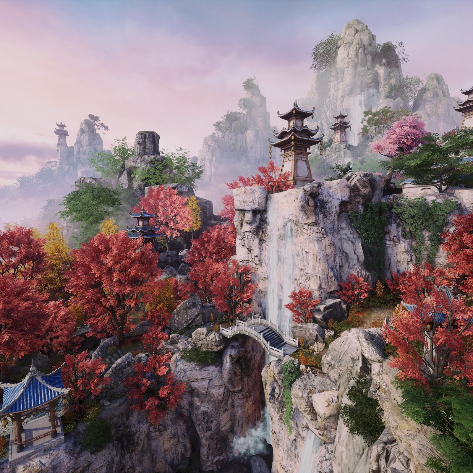 Asian Architecture, Oriental Landscape, Chinese Temple, Waterfall Scenery 4K Desktop and Mobile Wallpaper Background with a maximum resolution of 3840x2160 px.