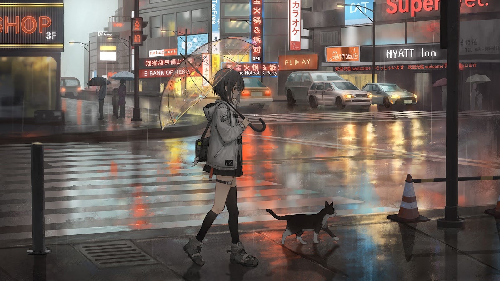 Anime Girl, Rain, City, Night Full HD Desktop and Mobile Wallpaper Background with a maximum resolution of 2008x1080 px.