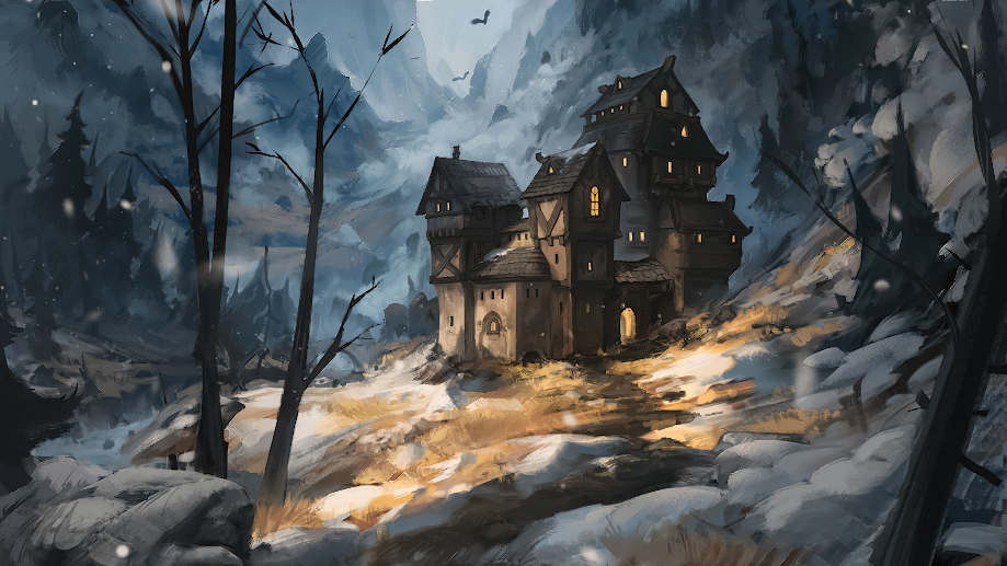 Fantasy House, Winter Landscape, Mountain House, Digital Art 4K Desktop and Mobile Wallpaper Background with a maximum resolution of 3840x2160 px.