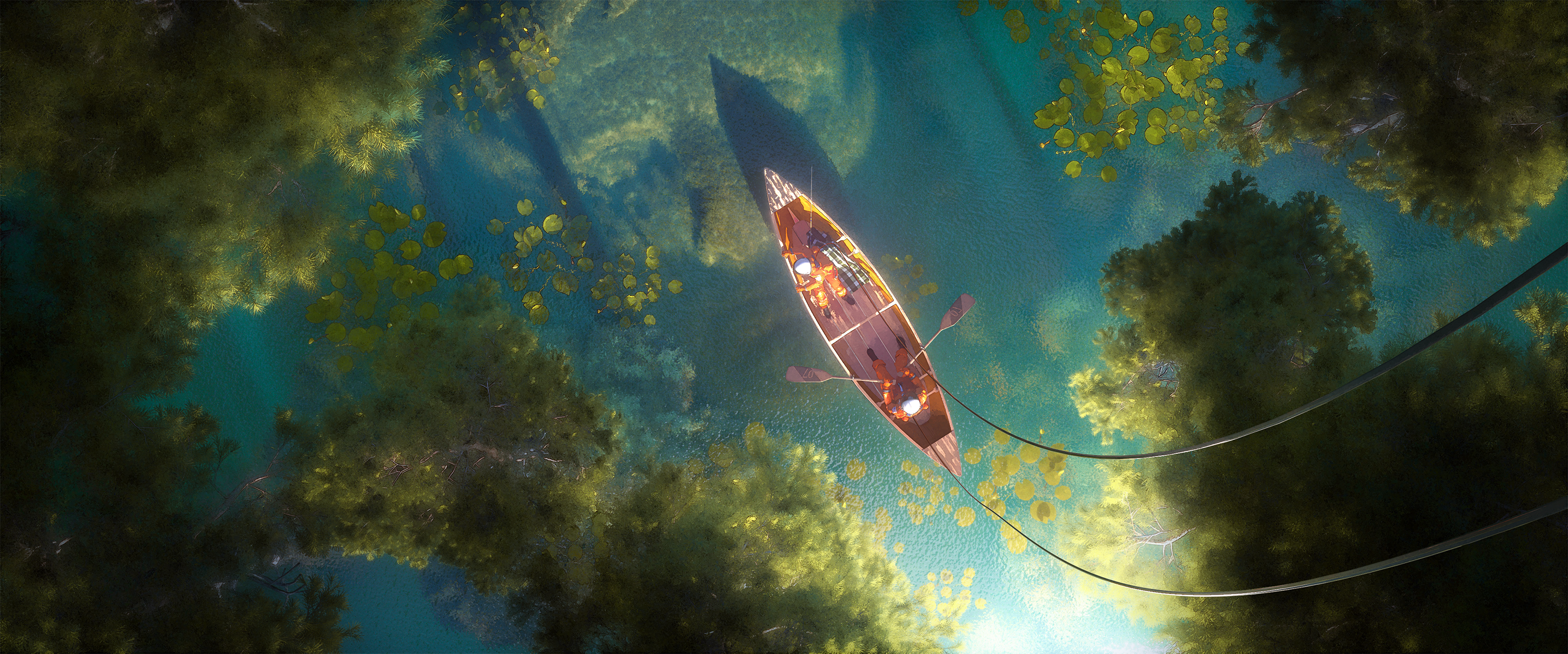Lake, Forest, Boat, Aerial View Full HD Desktop and Mobile Wallpaper Background with a maximum resolution of 2900x1210 px.