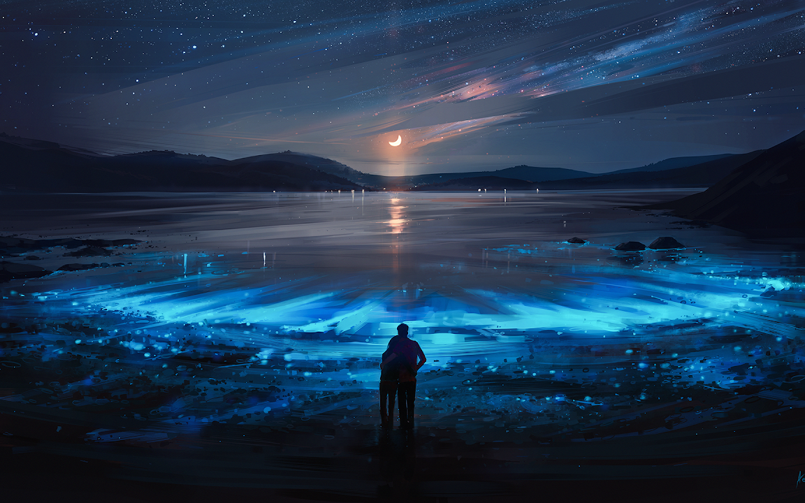 Night Sky, Ocean, Bioluminescent, Stars Full HD Desktop and Mobile Wallpaper Background with a maximum resolution of 1920x1080 px.