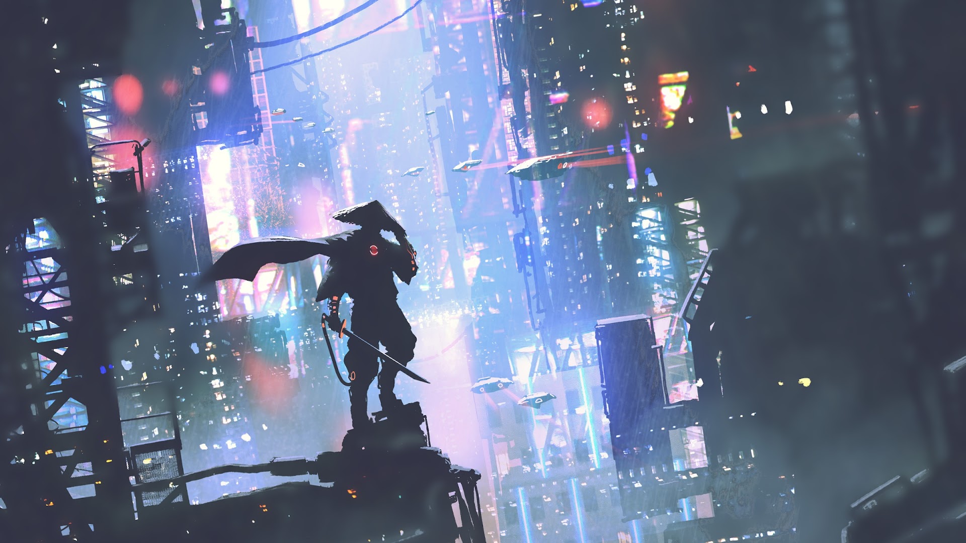 Cyberpunk, Futuristic City, Neon Lights, Digital Art Full HD Desktop Wallpaper