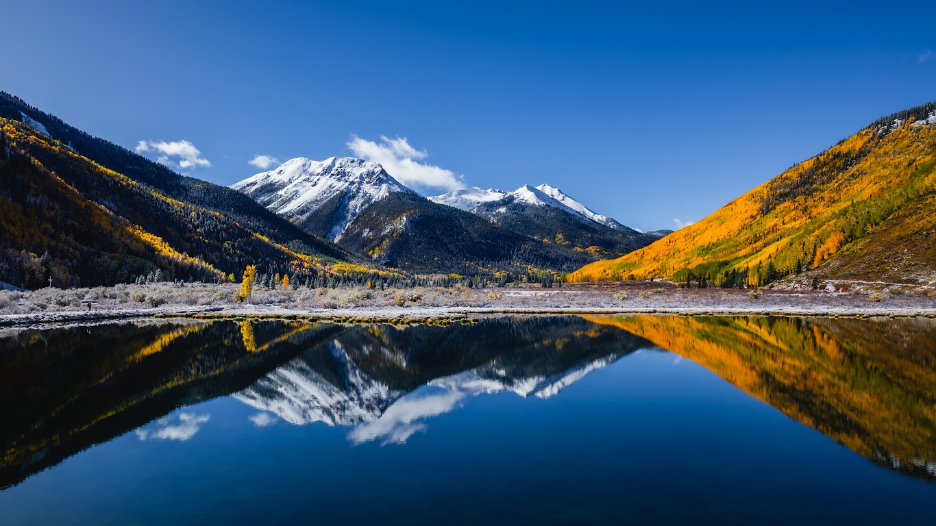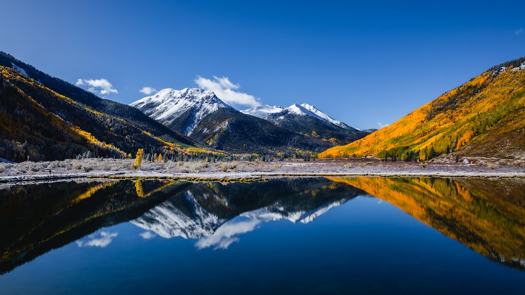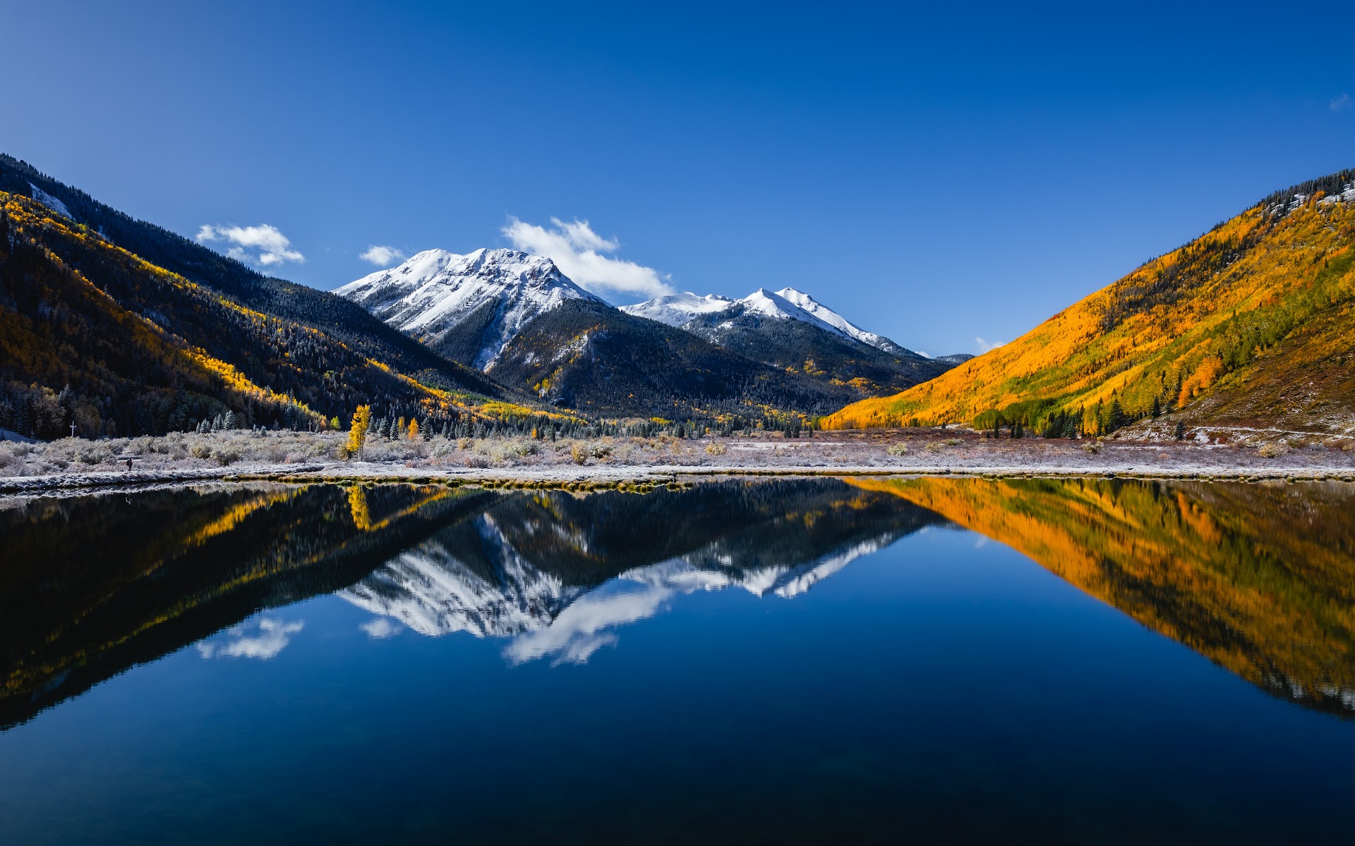 Mountain Lake, Fall Foliage, Reflection, Snow Capped Mountains 4K Desktop Wallpaper