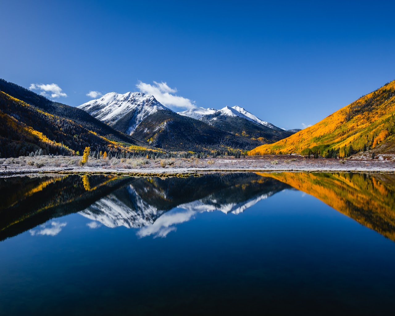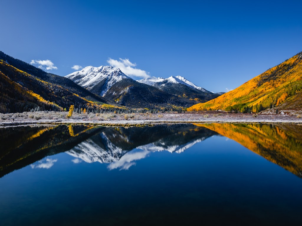 Mountain Lake, Fall Foliage, Reflection, Snow Capped Mountains 4K Wallpaper Background (4866x3244)