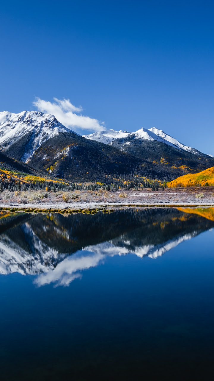 Mountain Lake, Fall Foliage, Reflection, Snow Capped Mountains 4K Desktop and Mobile Wallpaper Background with a maximum resolution of 4866x3244 px.
