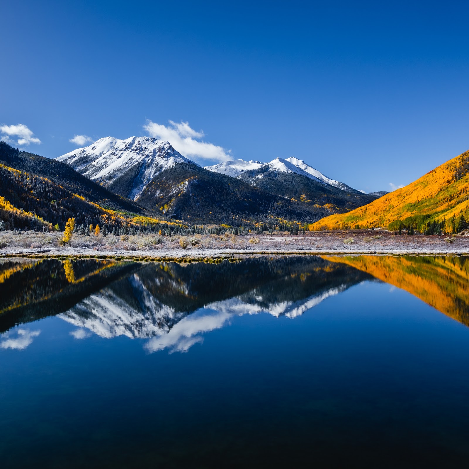 Mountain Lake, Fall Foliage, Reflection, Snow Capped Mountains 4K Desktop and Mobile Wallpaper Background with a maximum resolution of 4866x3244 px.