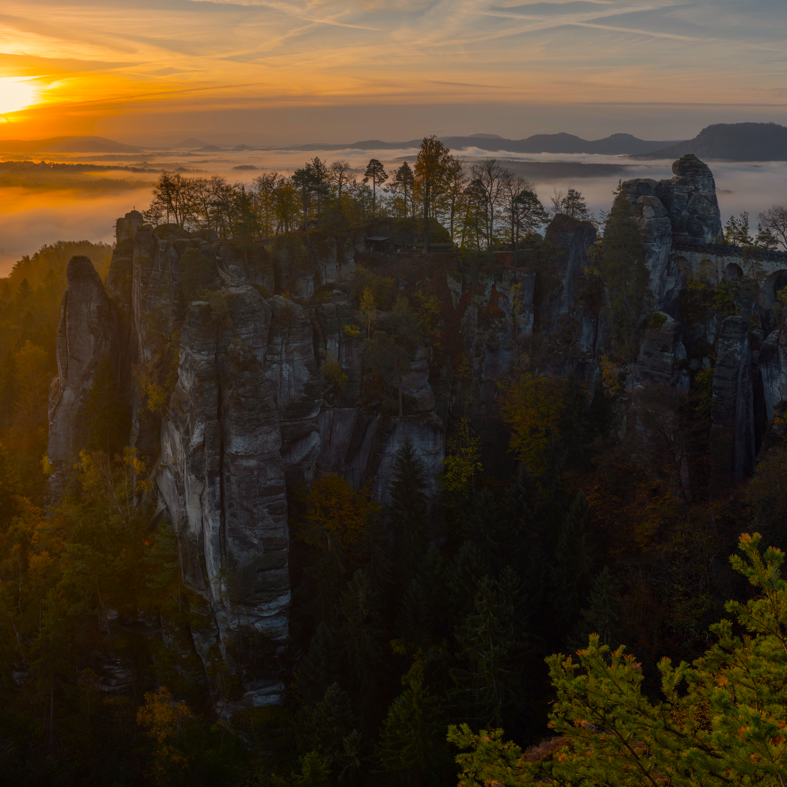 Sunrise, Mountain, Forest, Cliff 4K Desktop and Mobile Wallpaper Background with a maximum resolution of 3840x2160 px.