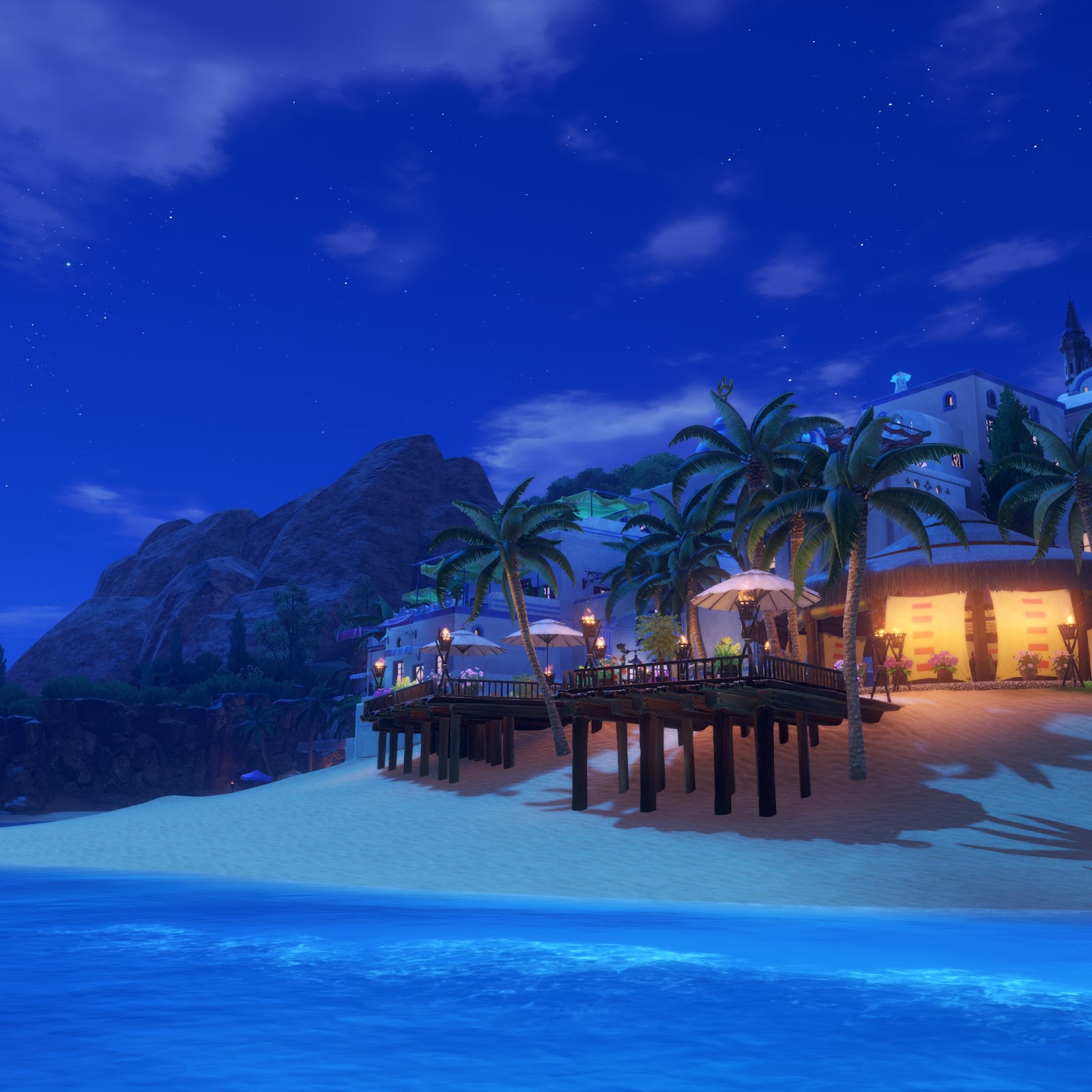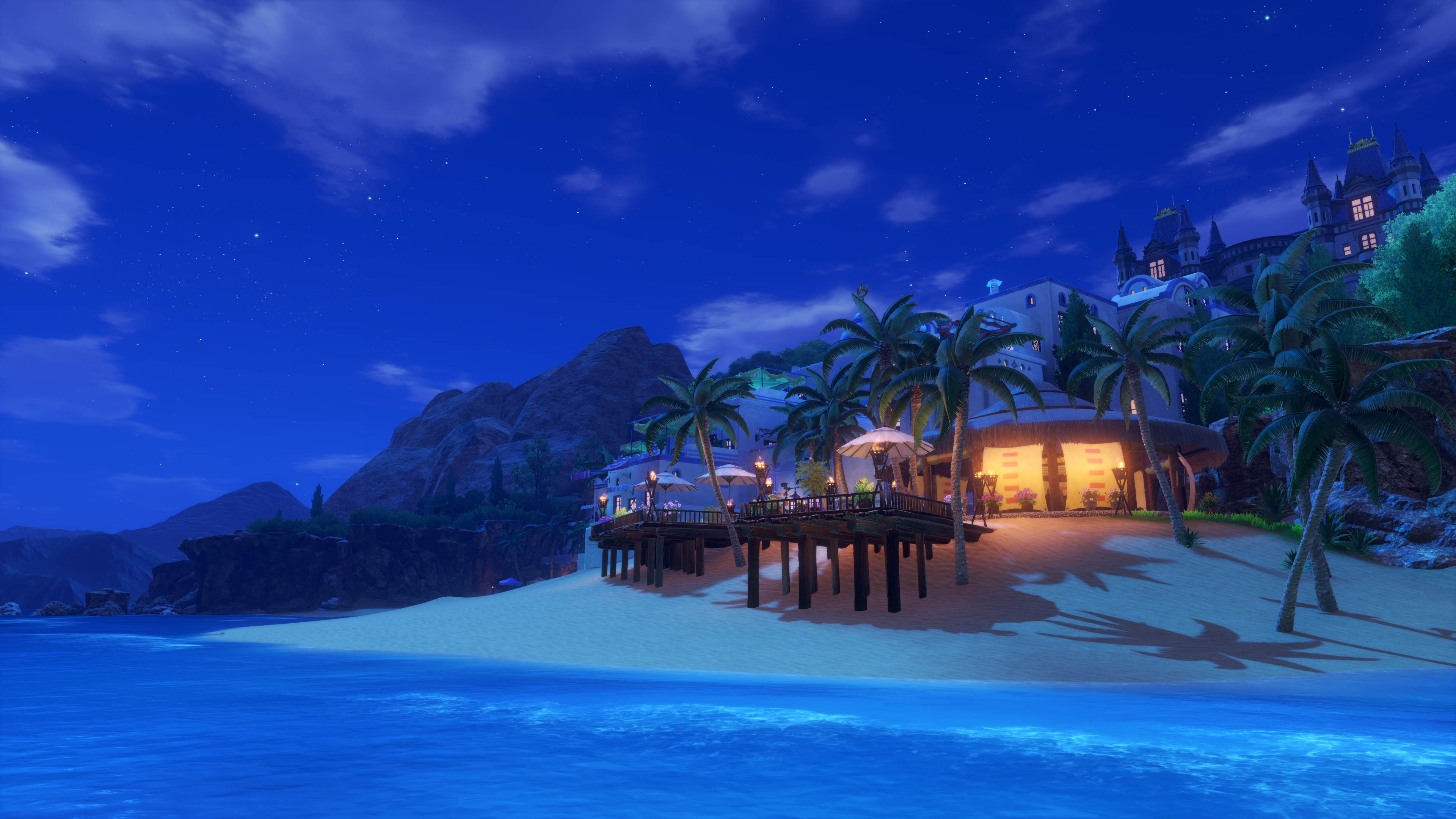 Tropical Beach, Night Sky, Ocean, Island Resort 4K Desktop and Mobile Wallpaper Background with a maximum resolution of 3840x2160 px.