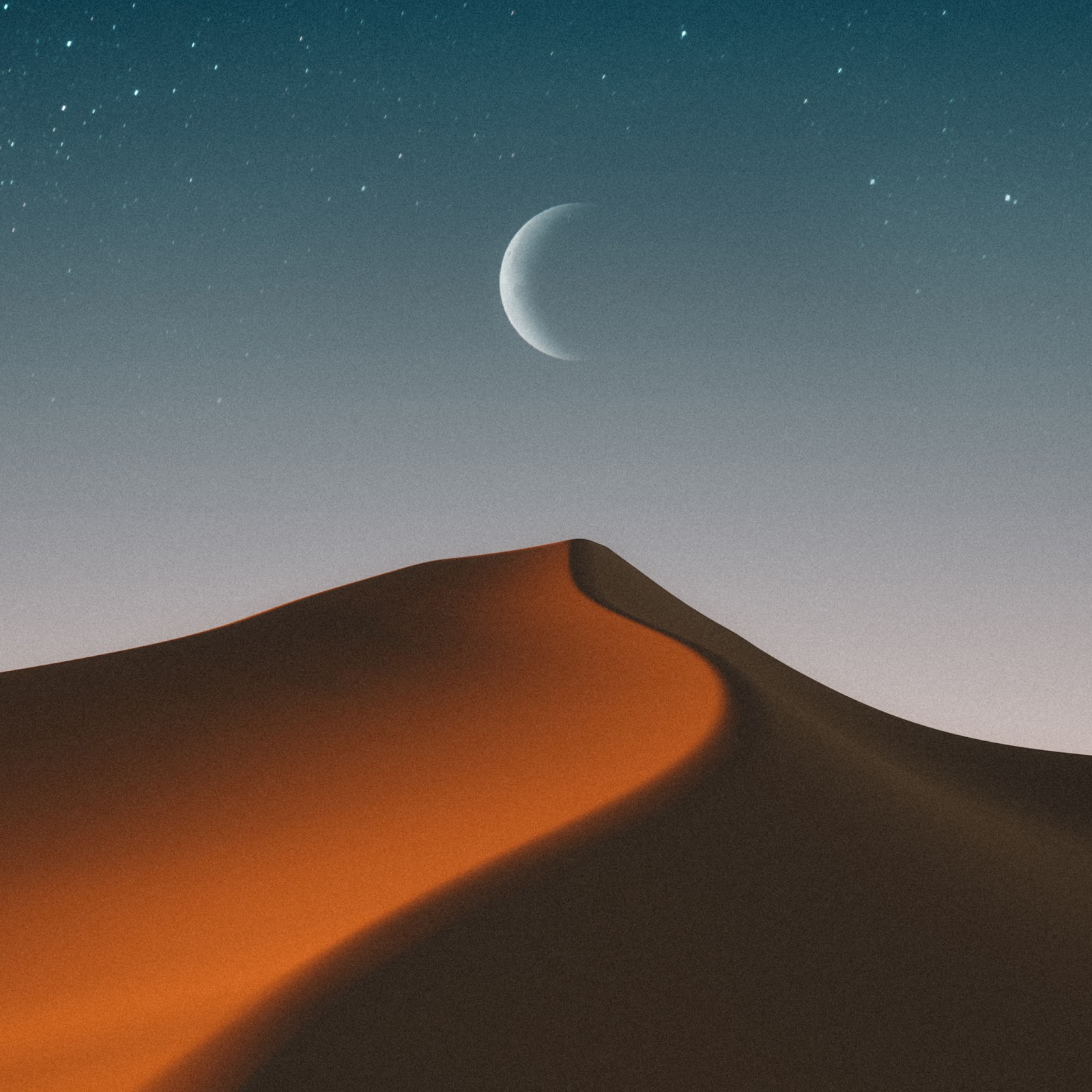 Desert, Night Sky, Crescent Moon, Sand Dune 4K Desktop and Mobile Wallpaper Background with a maximum resolution of 3840x2160 px.