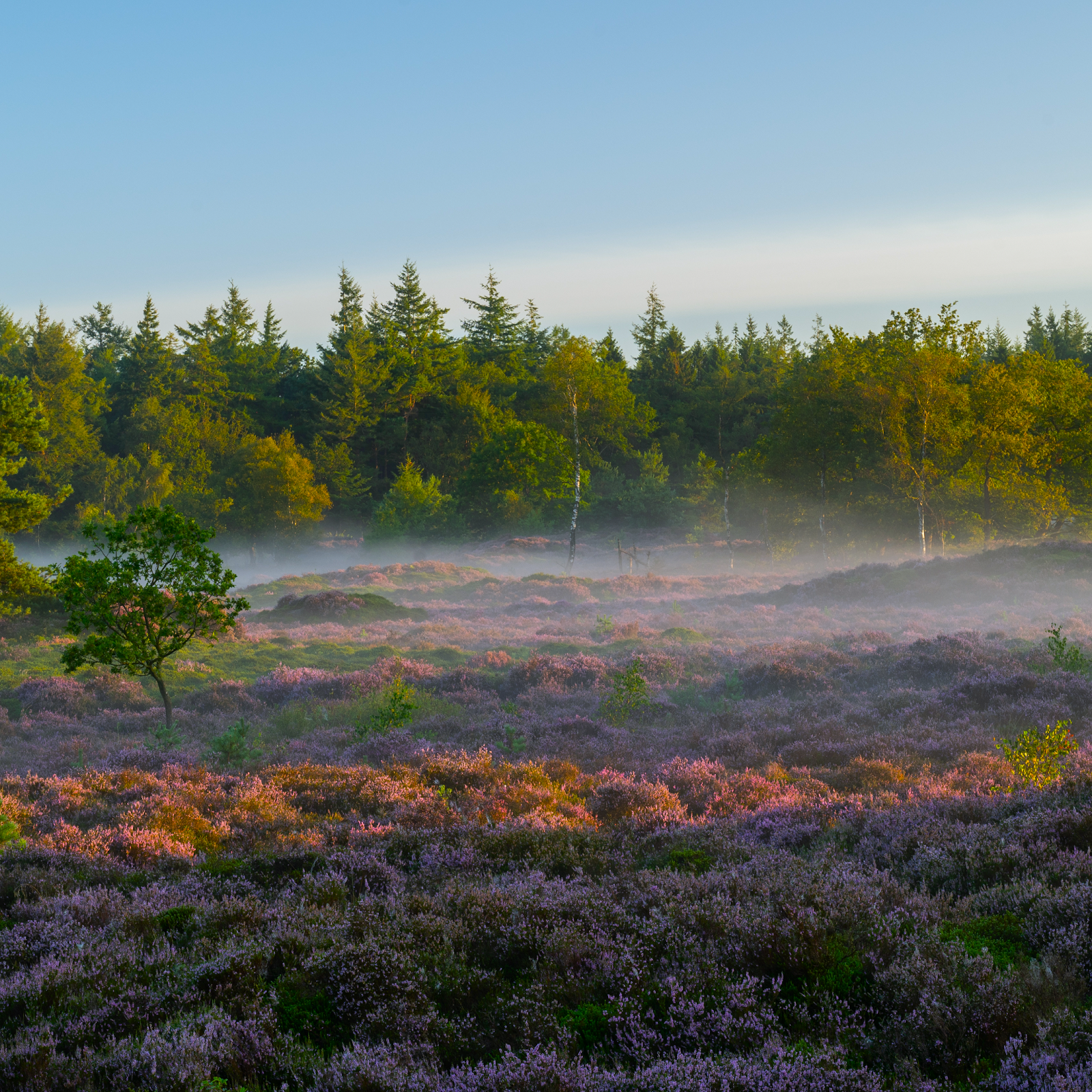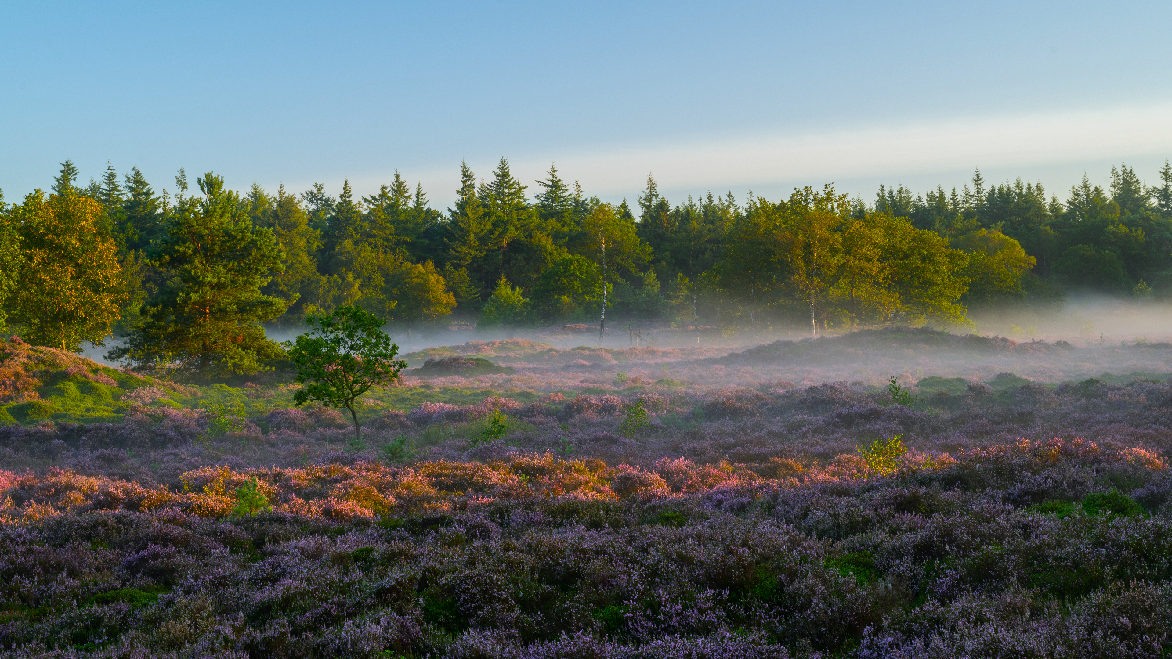 Forest, Heather, Fog, Sunrise 4K Desktop and Mobile Wallpaper Background with a maximum resolution of 3840x2160 px.