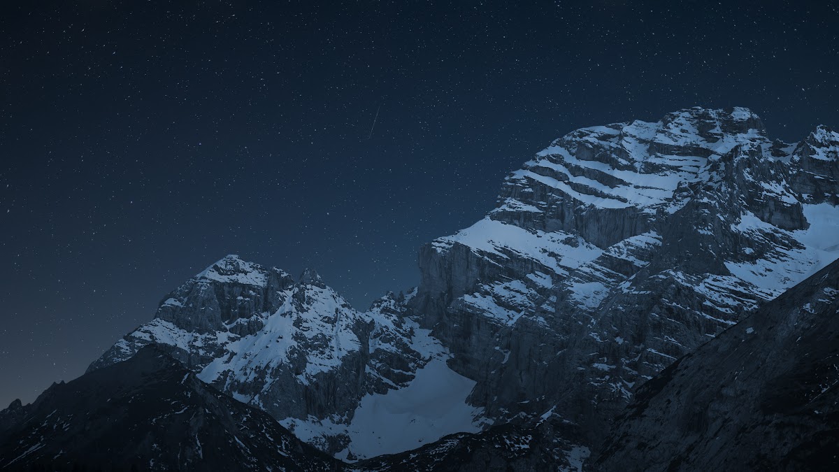 Night Sky, Mountains, Starry Night, Snow Capped Mountains 4K Desktop and Mobile Wallpaper Background with a maximum resolution of 4278x2407 px.