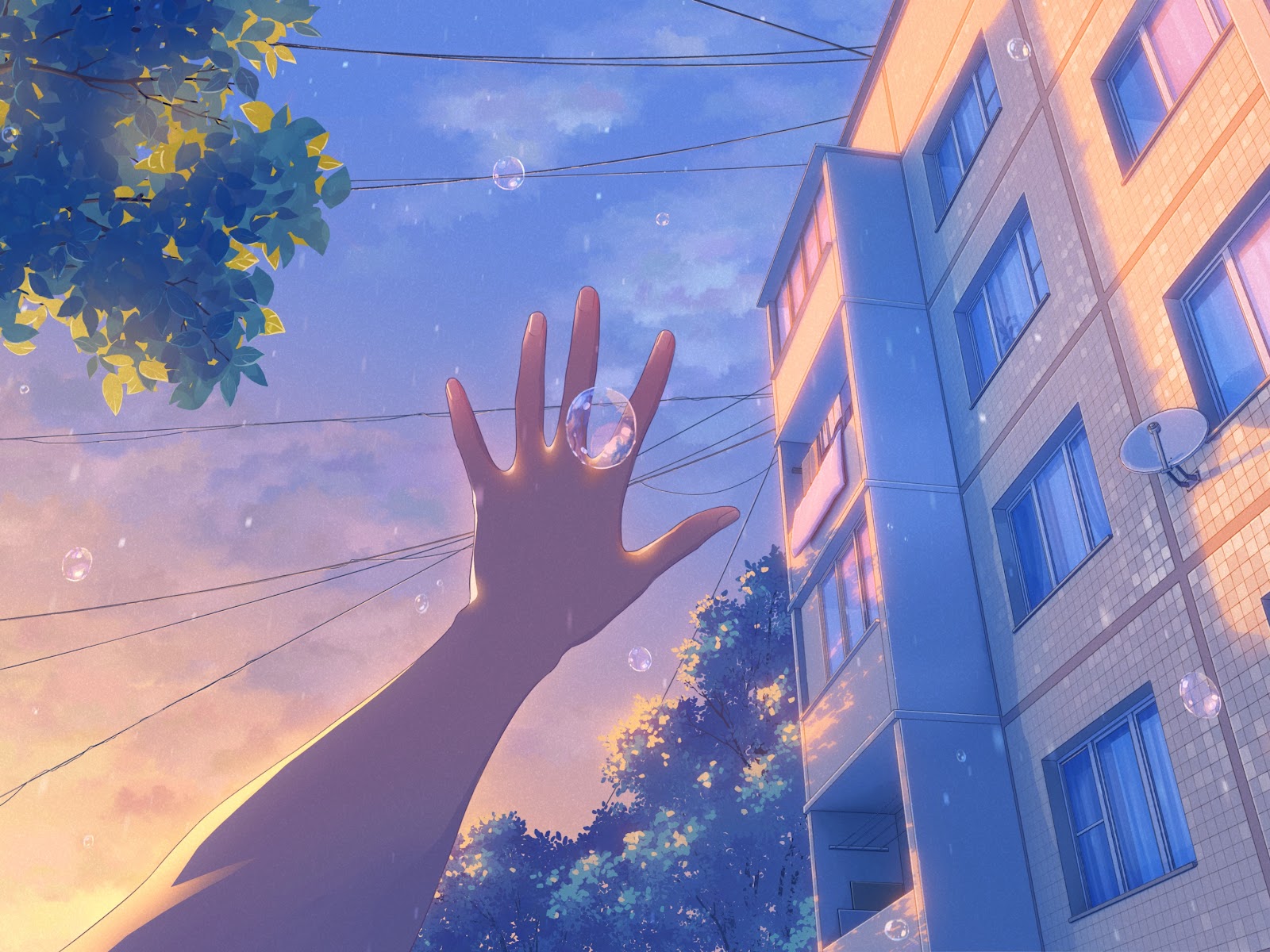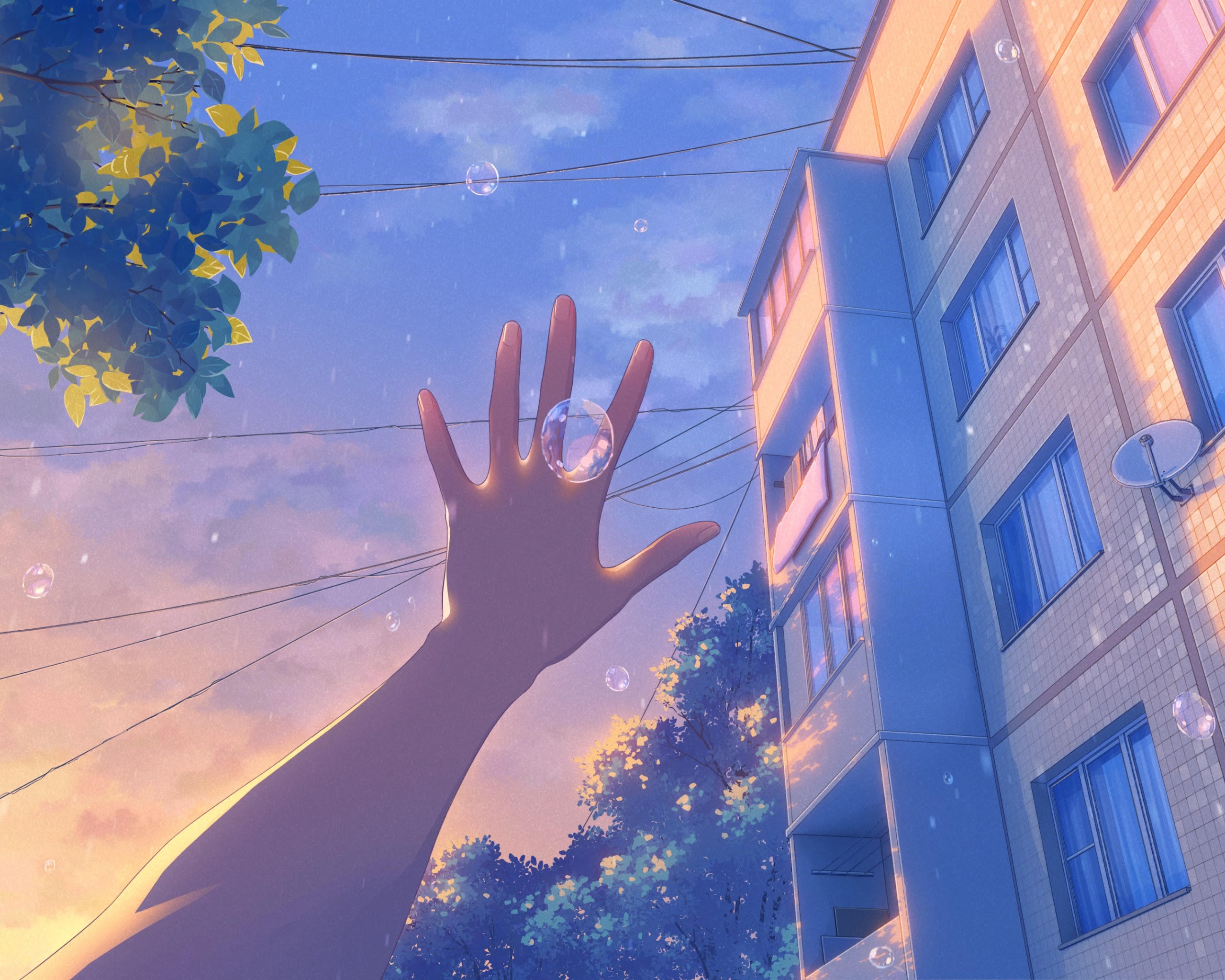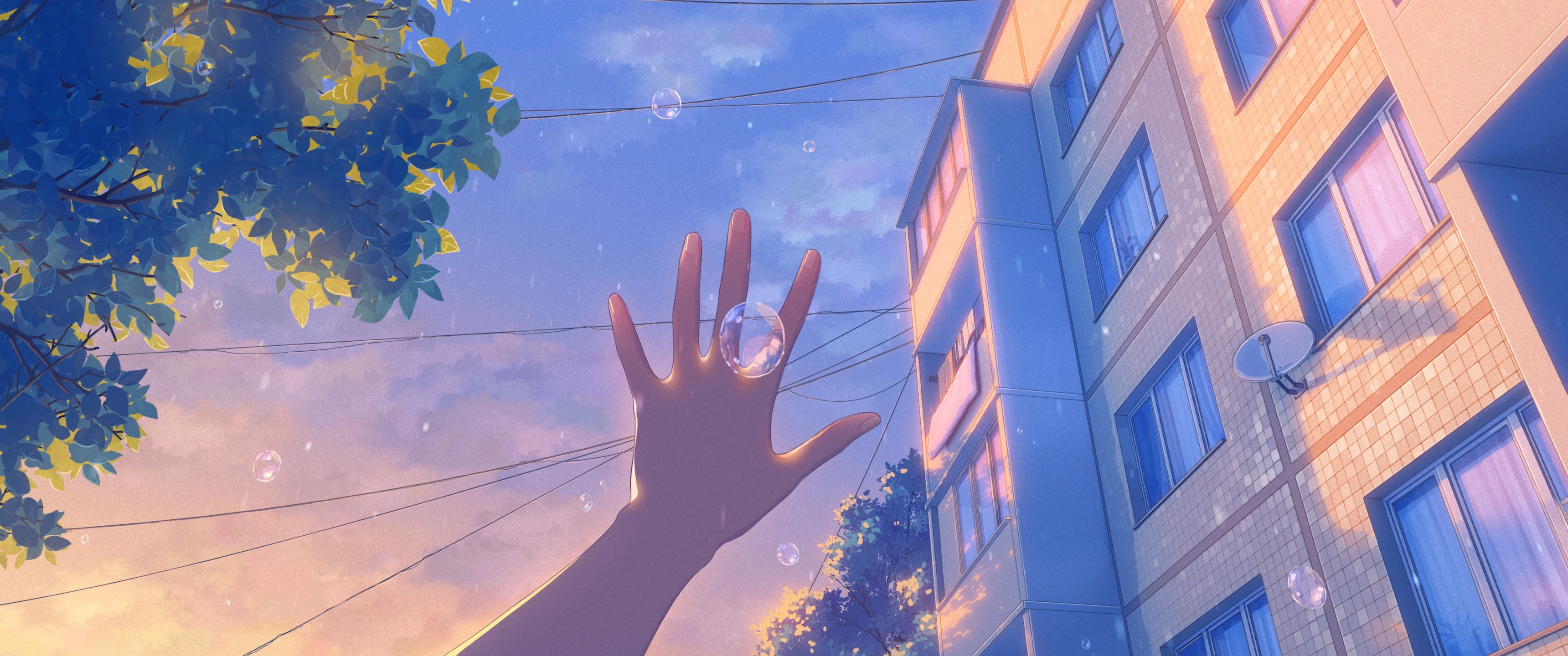Anime, Cityscape, Sunset, Bubbles 4K Desktop and Mobile Wallpaper Background with a maximum resolution of 3840x2160 px.