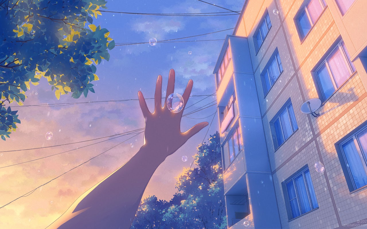 Anime, Cityscape, Sunset, Bubbles 4K PC Wallpaper