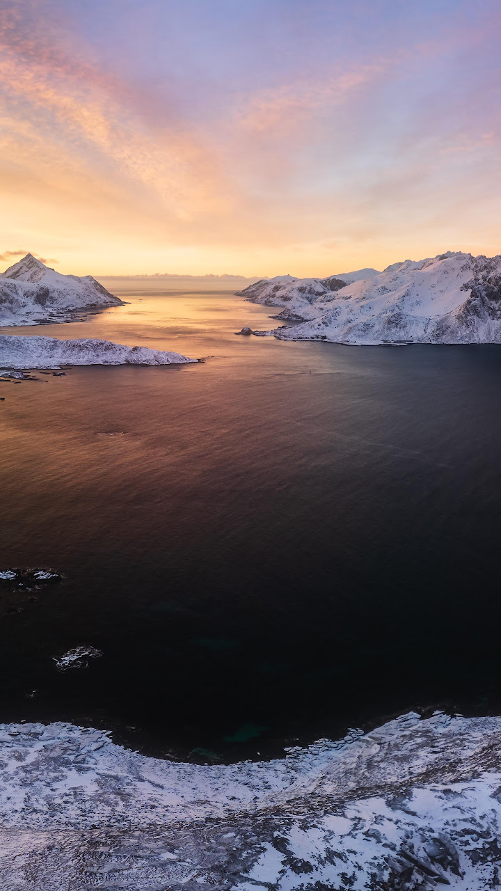Arctic Landscape, Norwegian Landscape, Winter Mountains, Sunset Mountains 5K Desktop and Mobile Wallpaper Background with a maximum resolution of 7309x3266 px.