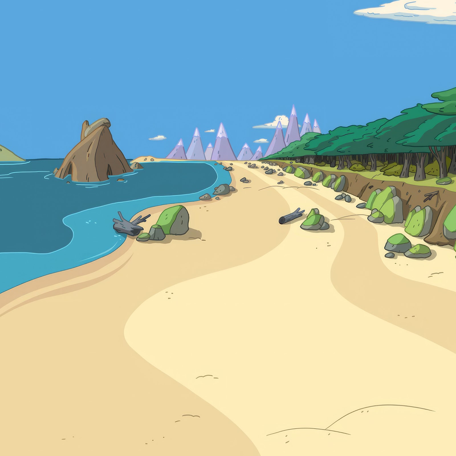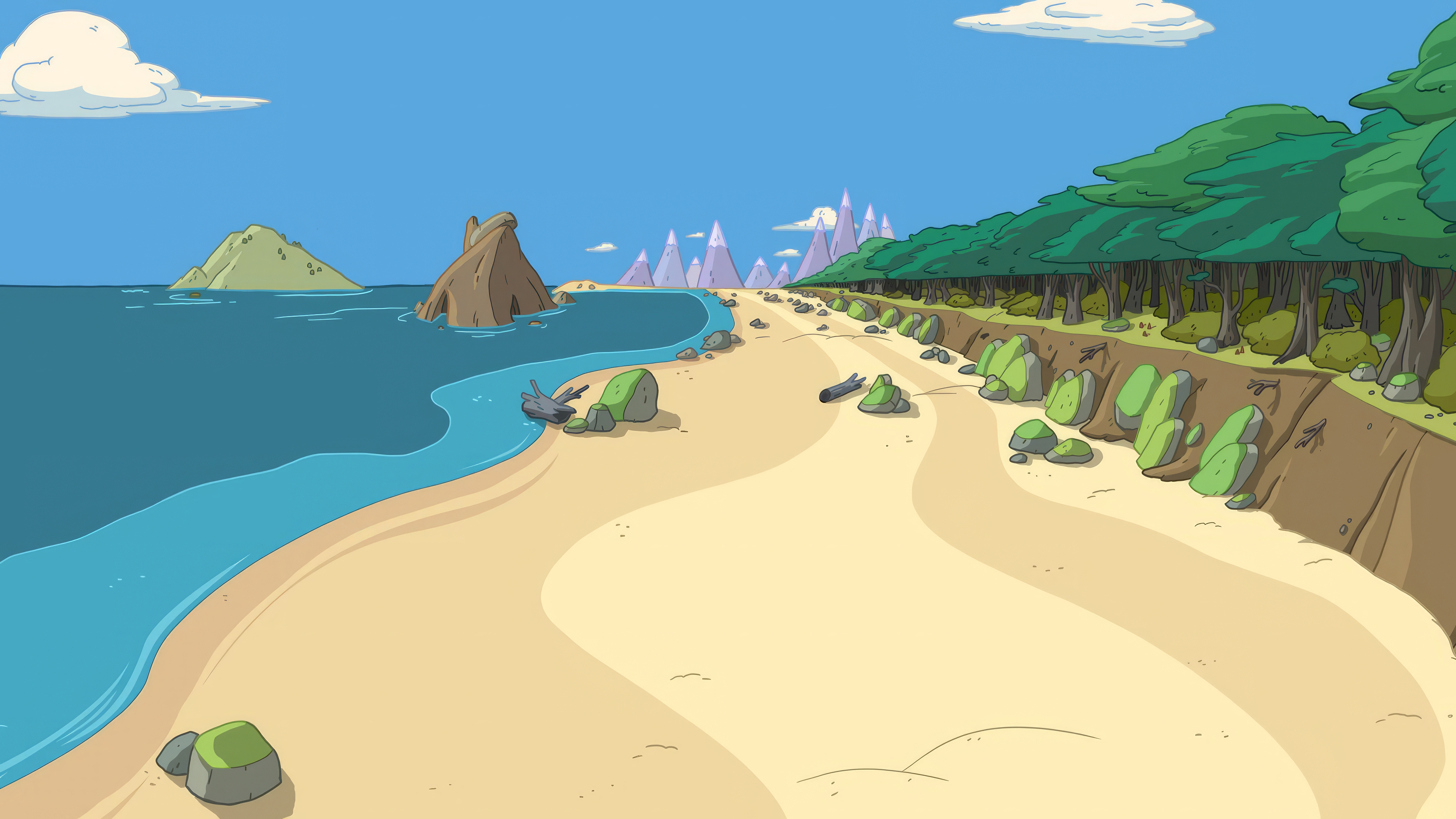 Beach Scene, Ocean View, Cartoon Landscape, Coastal Forest 4K Desktop Wallpaper