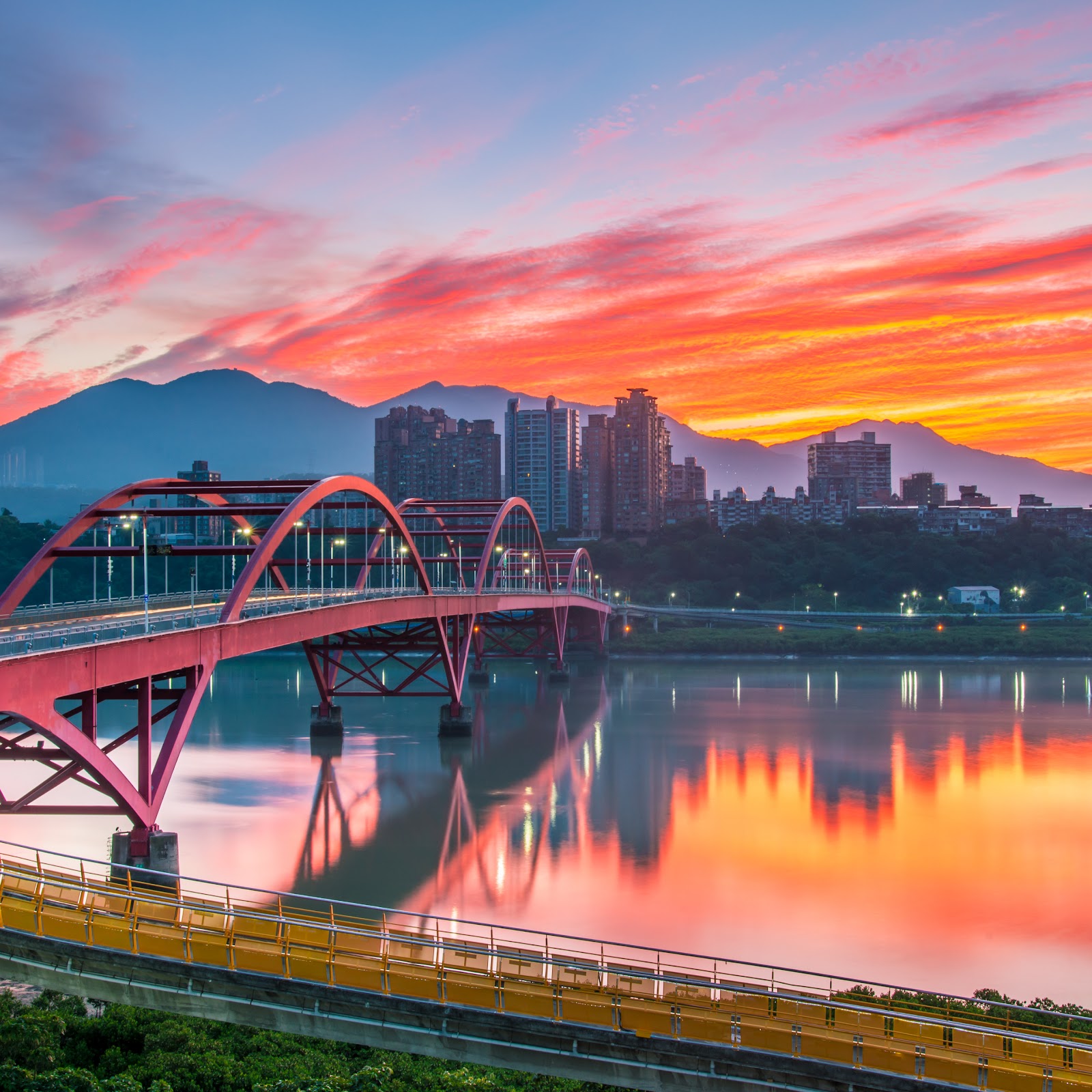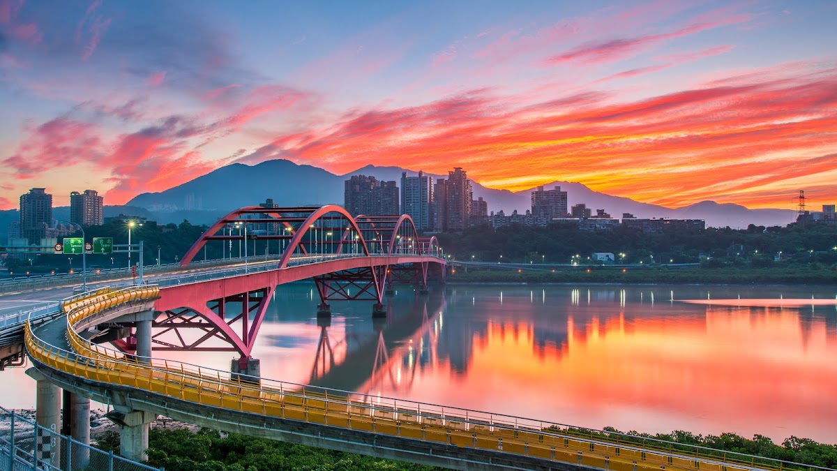 Bridge, Sunset, Cityscape, River 5K Desktop and Mobile Wallpaper Background with a maximum resolution of 5120x2880 px.