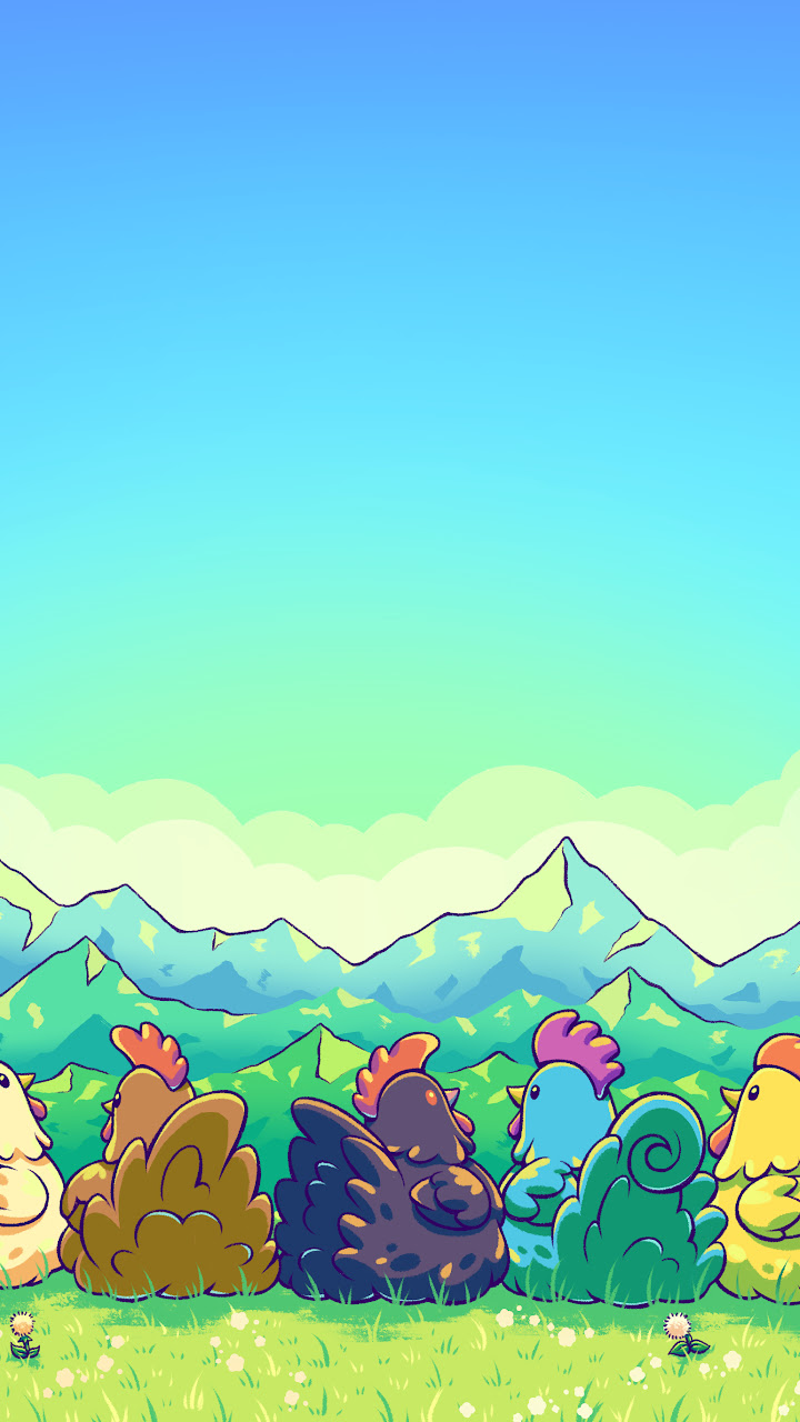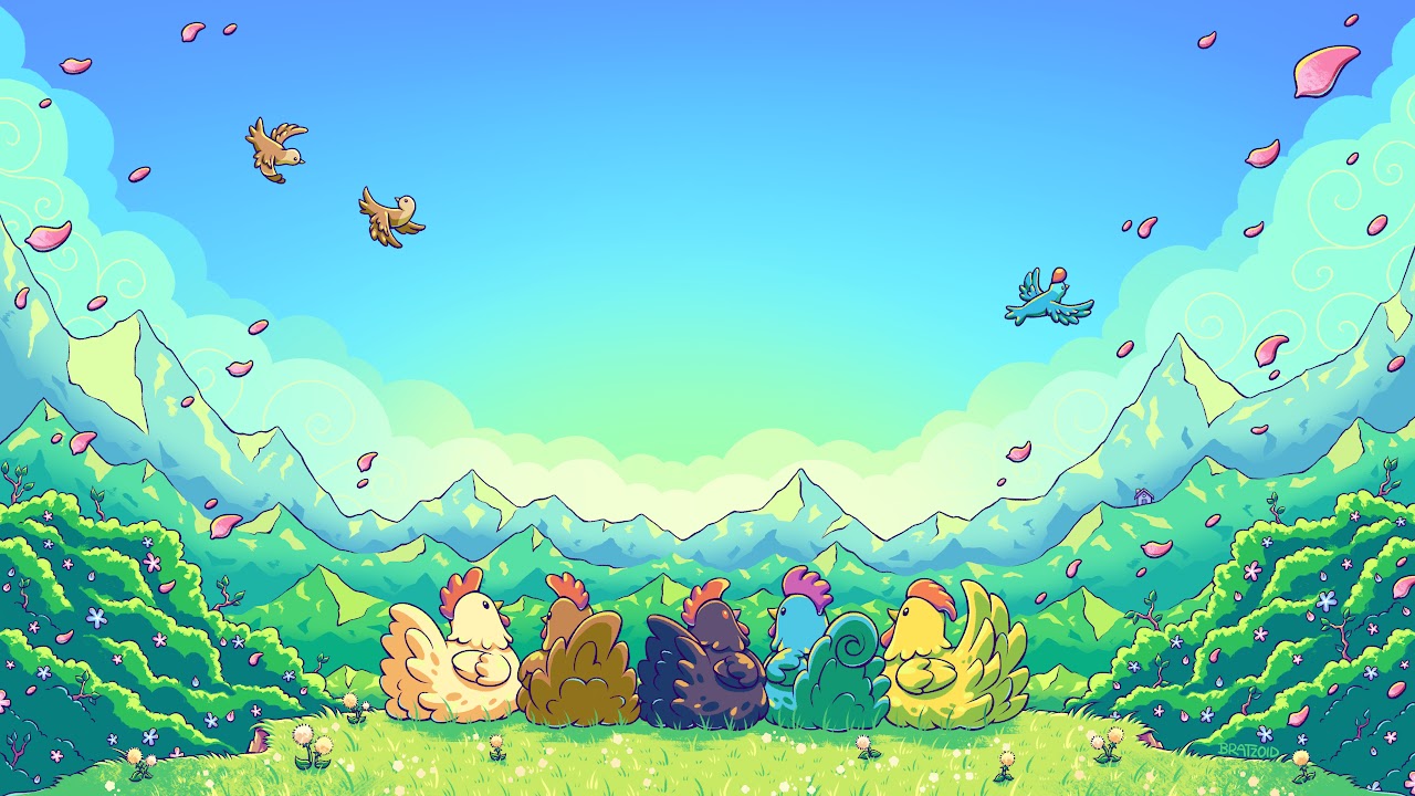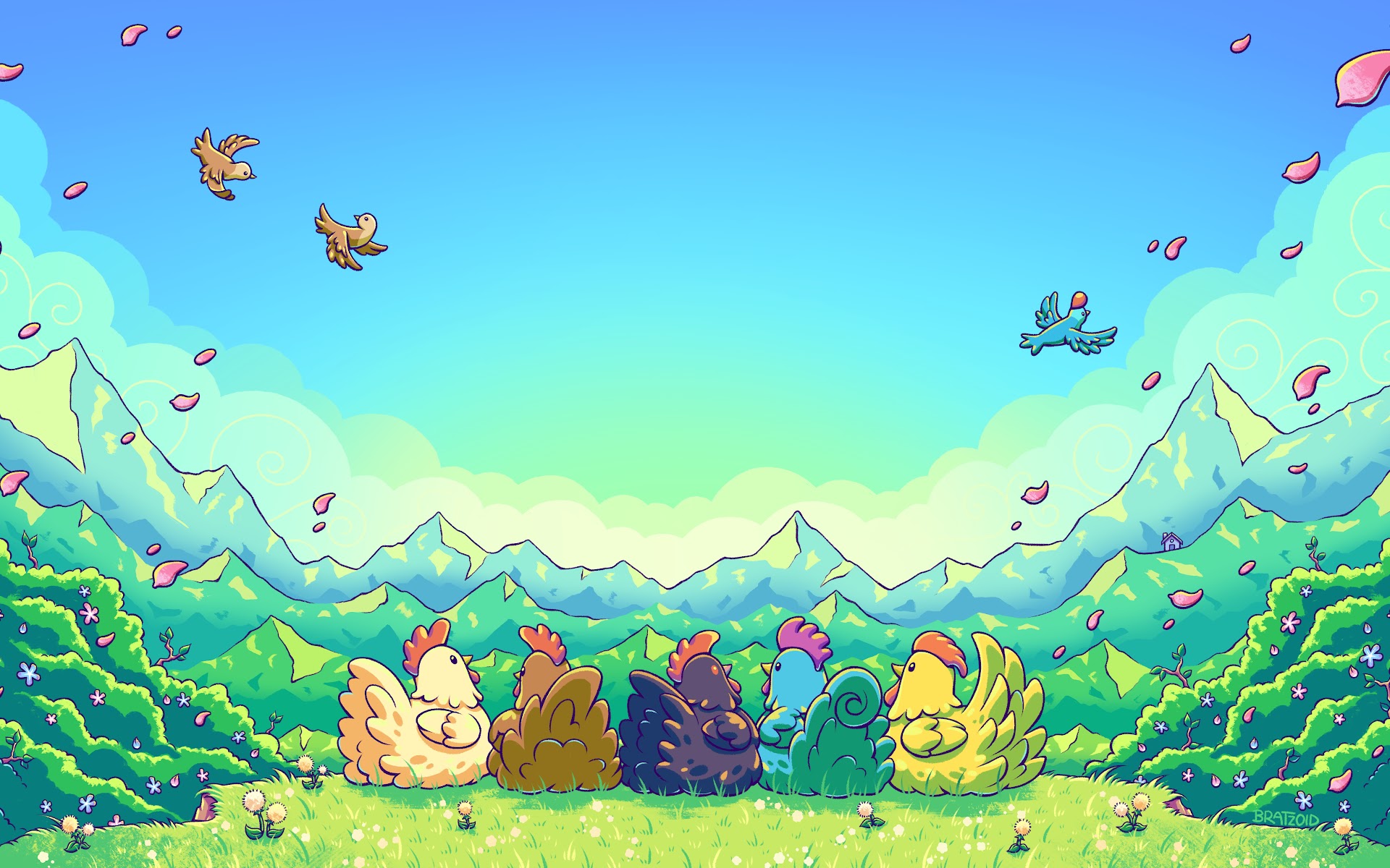 Cartoon Chickens, Mountain Landscape, Spring Season, Cute Animals 4K Desktop and Mobile Wallpaper Background with a maximum resolution of 4869x2739 px.