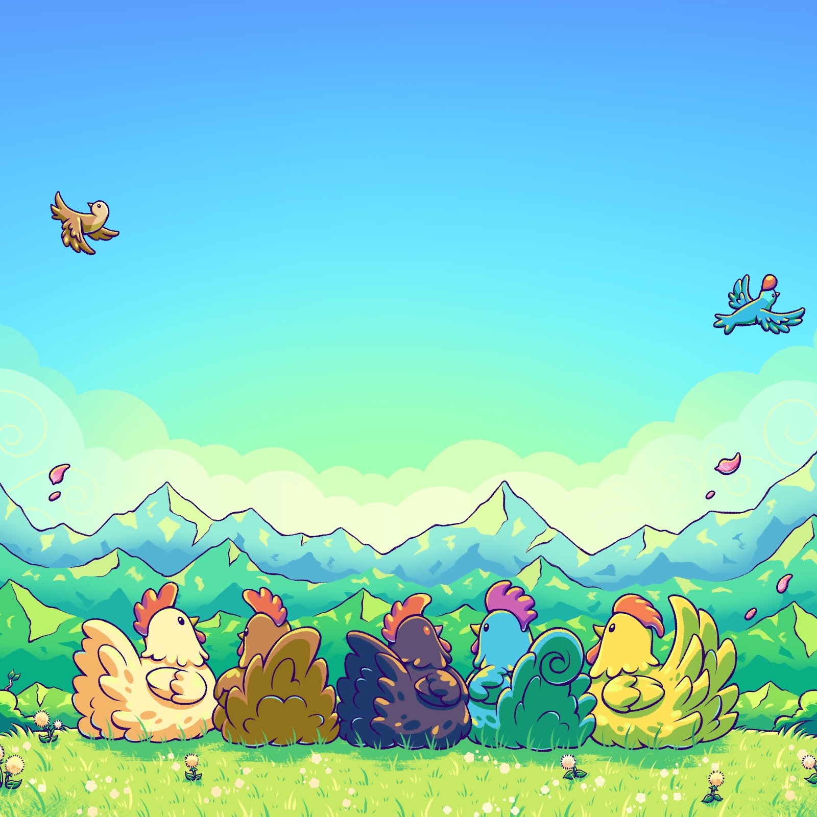 Cartoon Chickens, Mountain Landscape, Spring Season, Cute Animals 4K Desktop and Mobile Wallpaper Background with a maximum resolution of 4869x2739 px.
