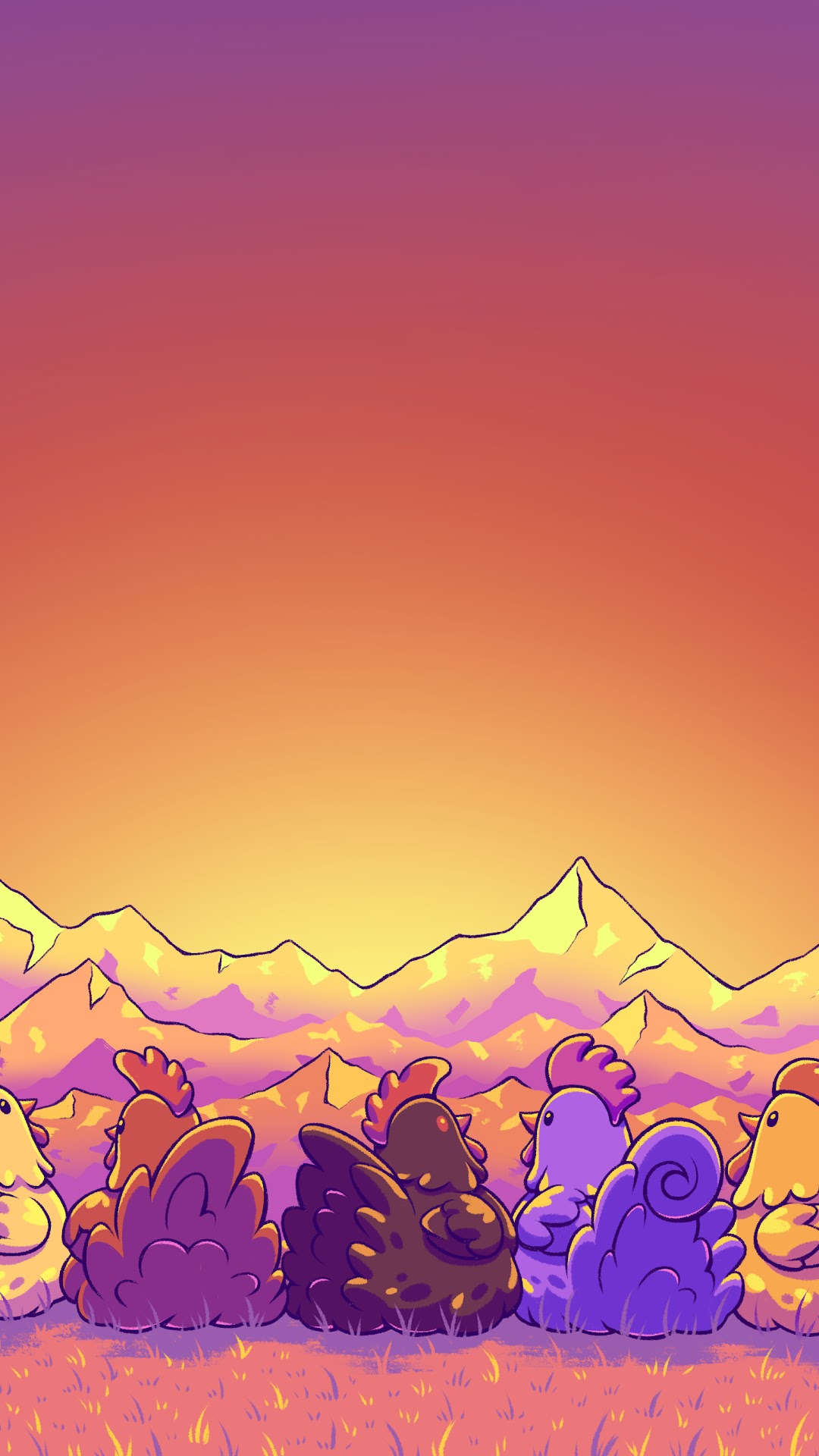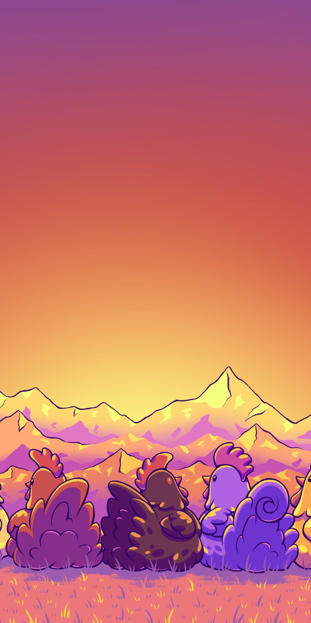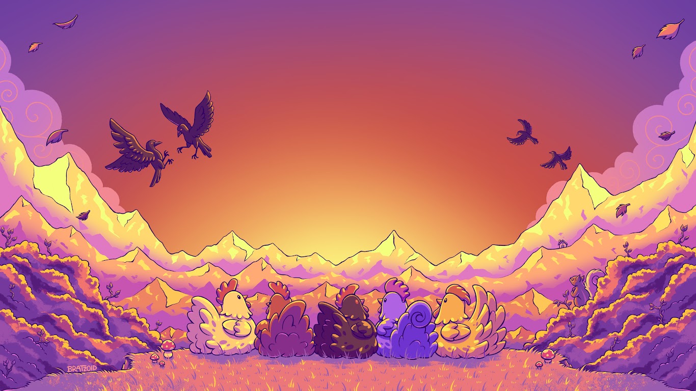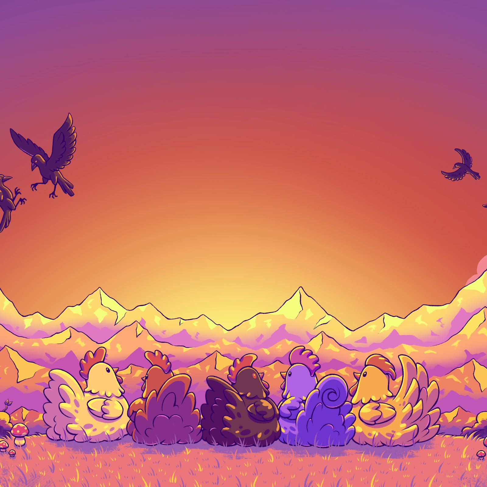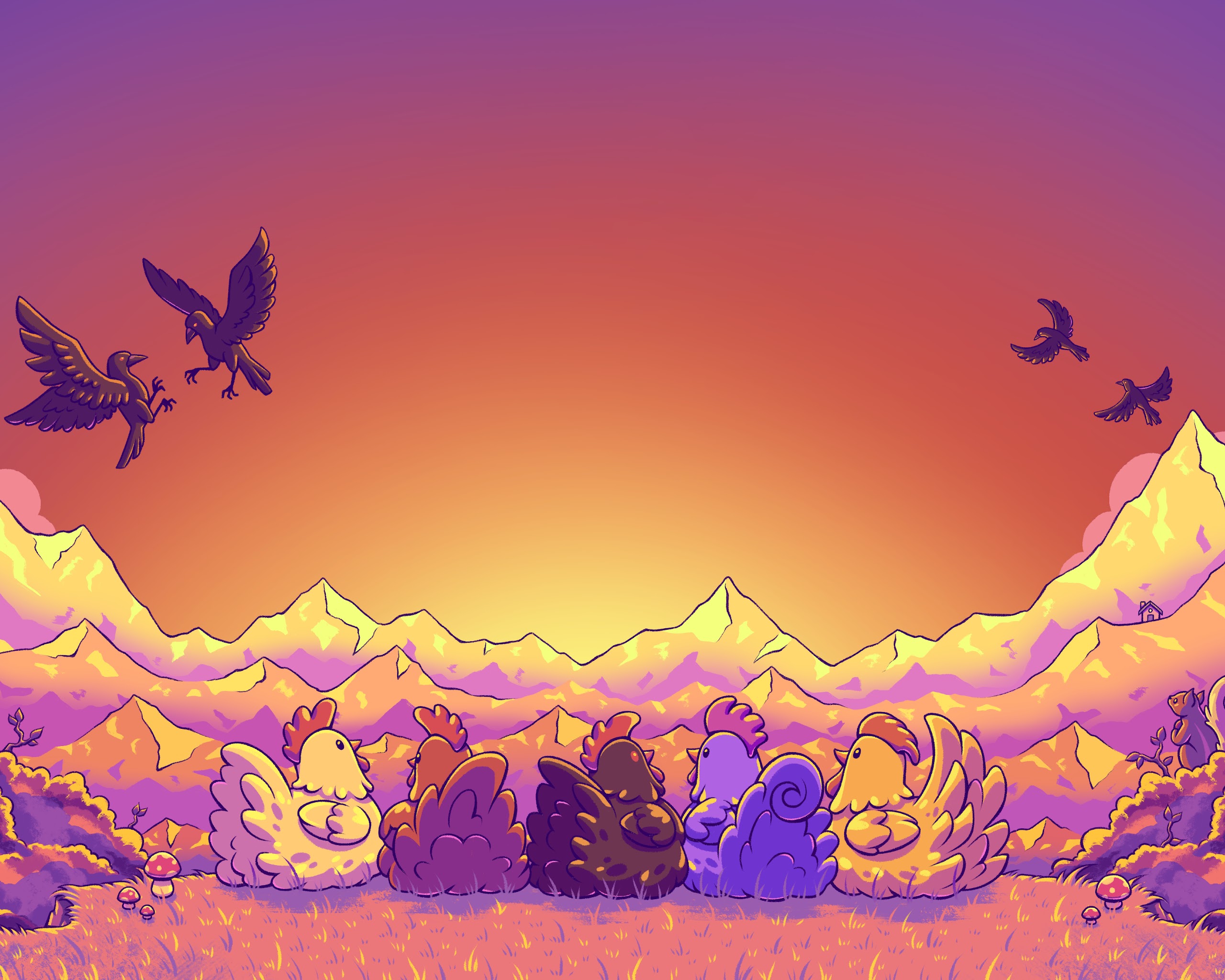 Cartoon, Sunset, Chickens, Mountains 4K Desktop and Mobile Wallpaper Background with a maximum resolution of 4869x2739 px.