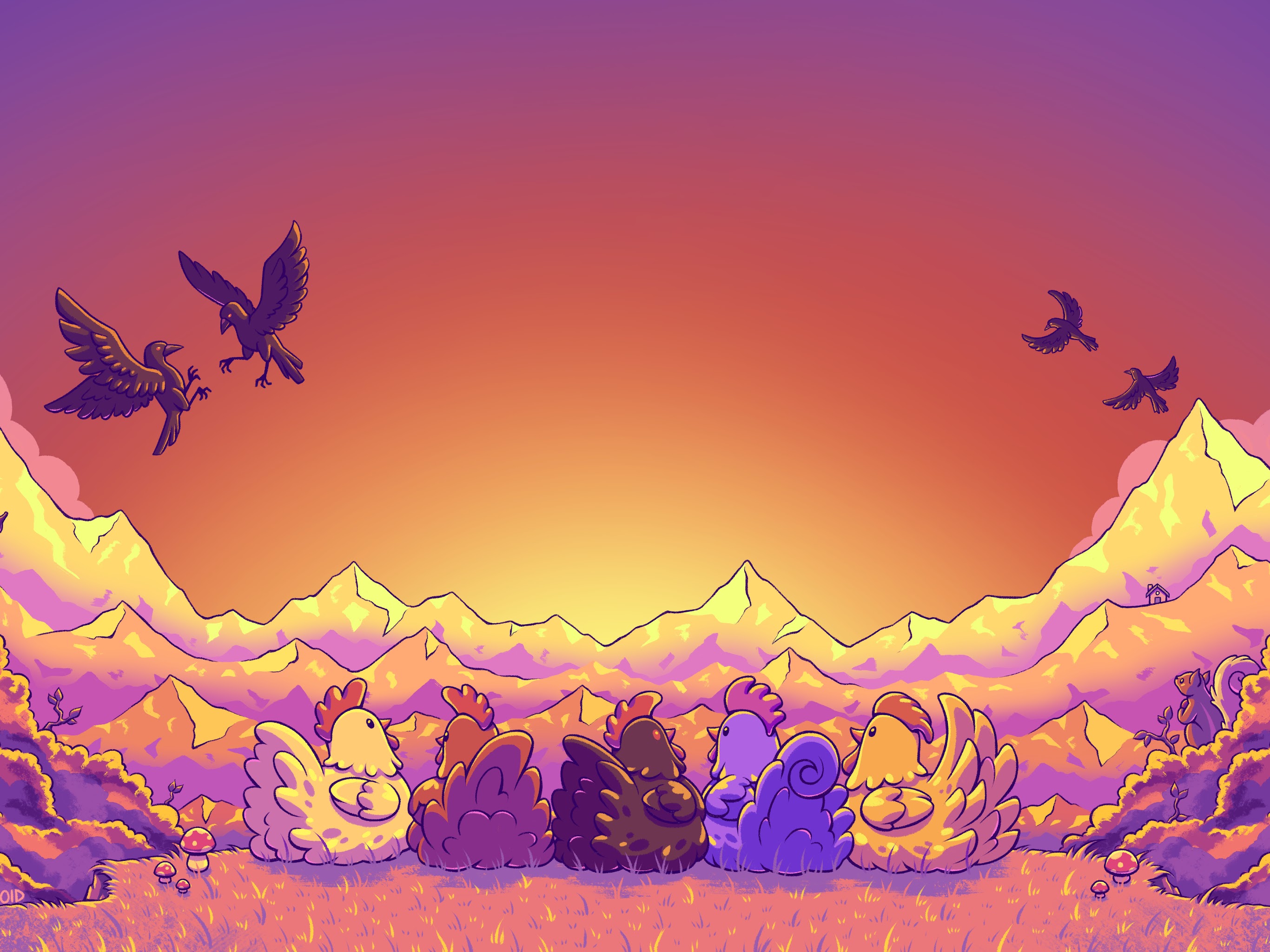 Cartoon, Sunset, Chickens, Mountains 4K Desktop Wallpaper