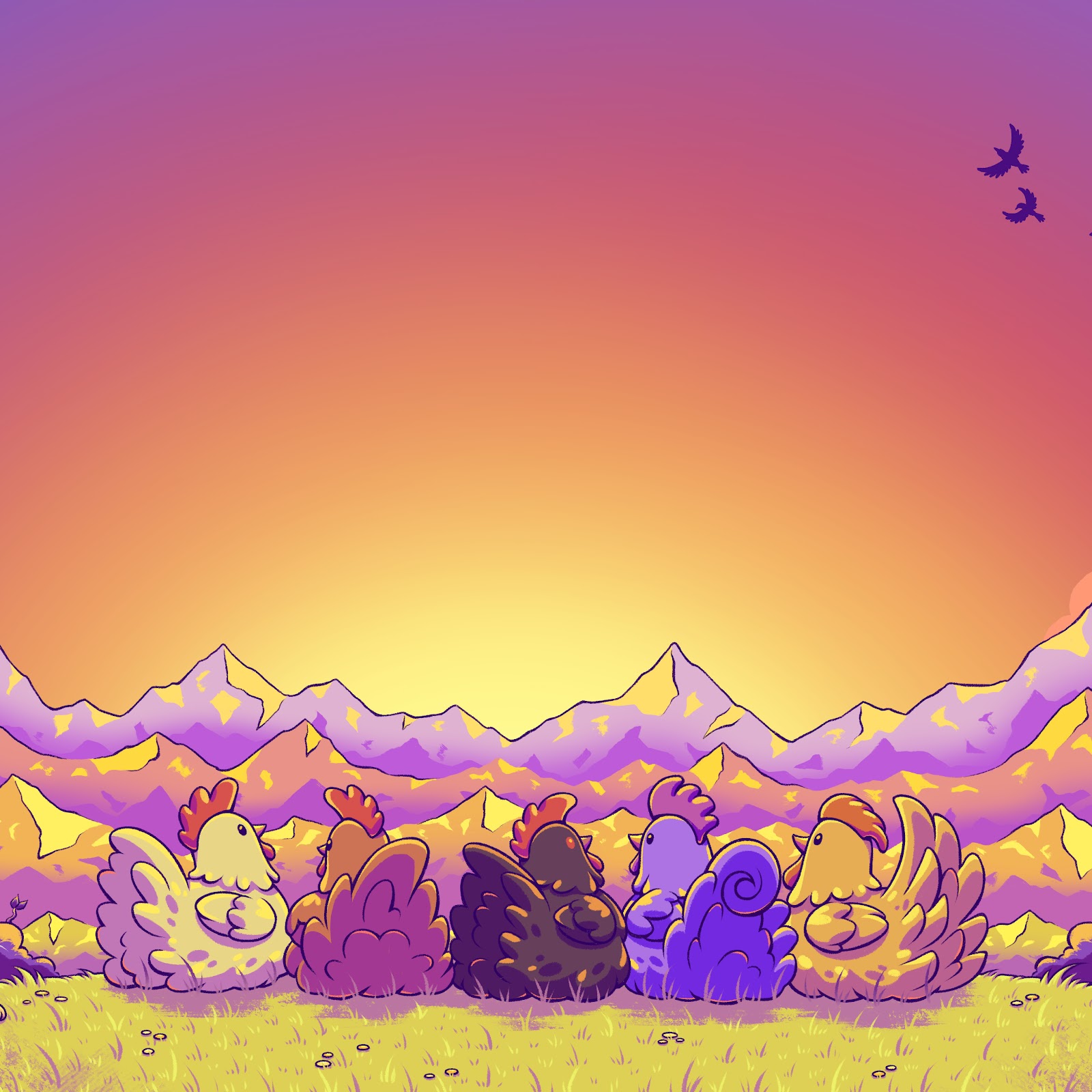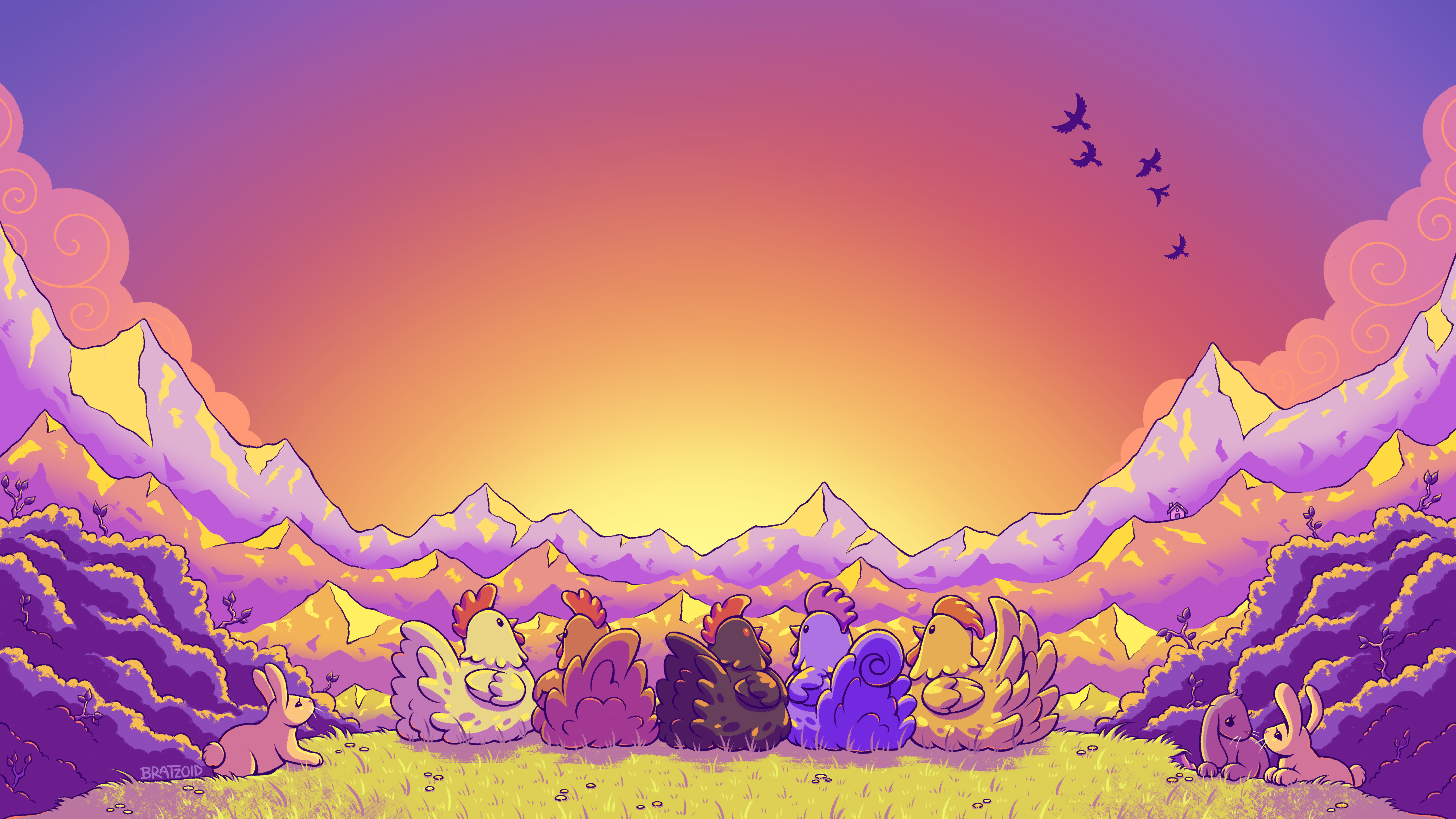 Cute Chicken Illustration, Mountain Scenery, Sunset Art, Whimsical Art 4K Desktop and Mobile Wallpaper Background with a maximum resolution of 4869x2739 px.