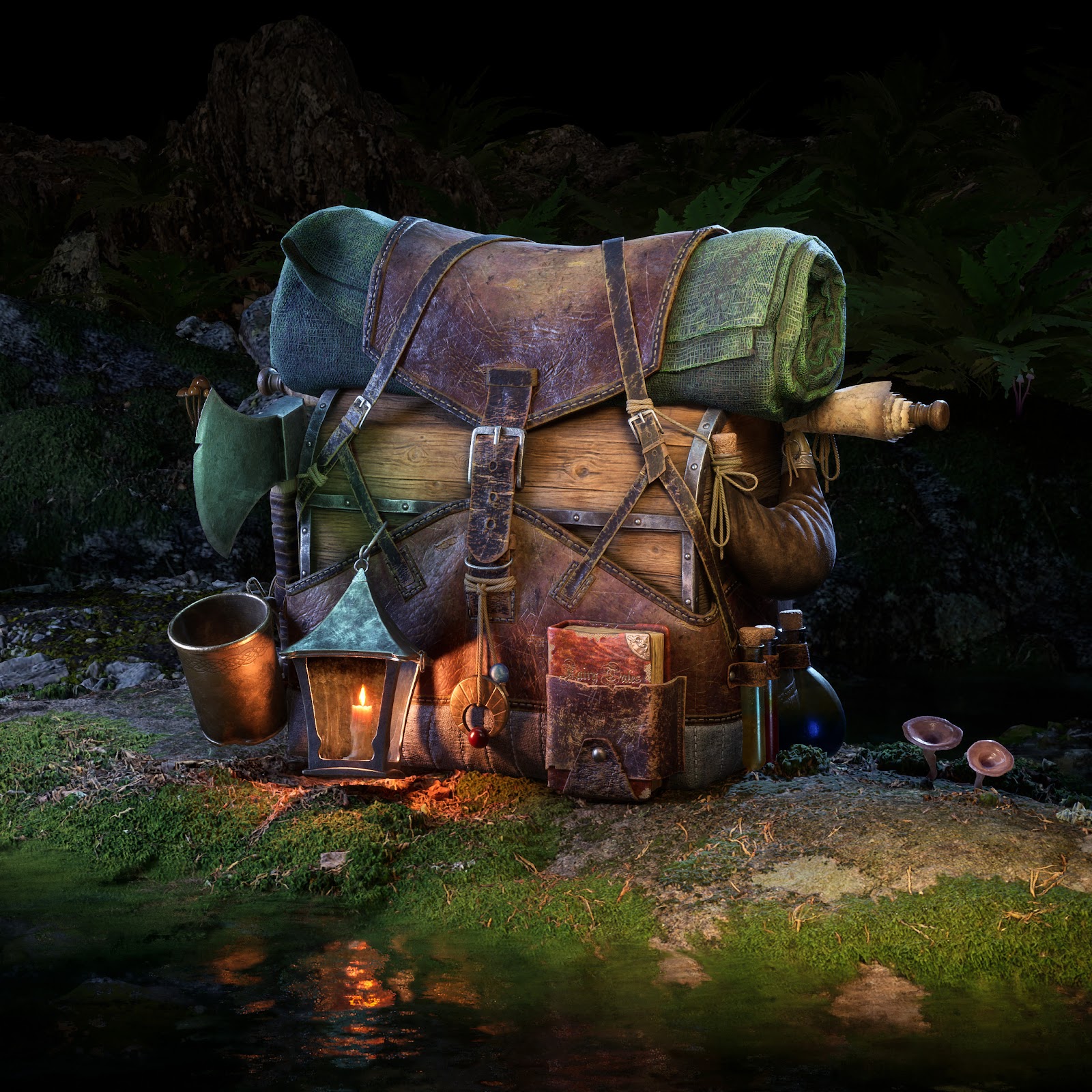 Fantasy Backpack, Medieval Pack, Adventurer Gear, 3D Render 4K Desktop and Mobile Wallpaper Background with a maximum resolution of 3840x2196 px.