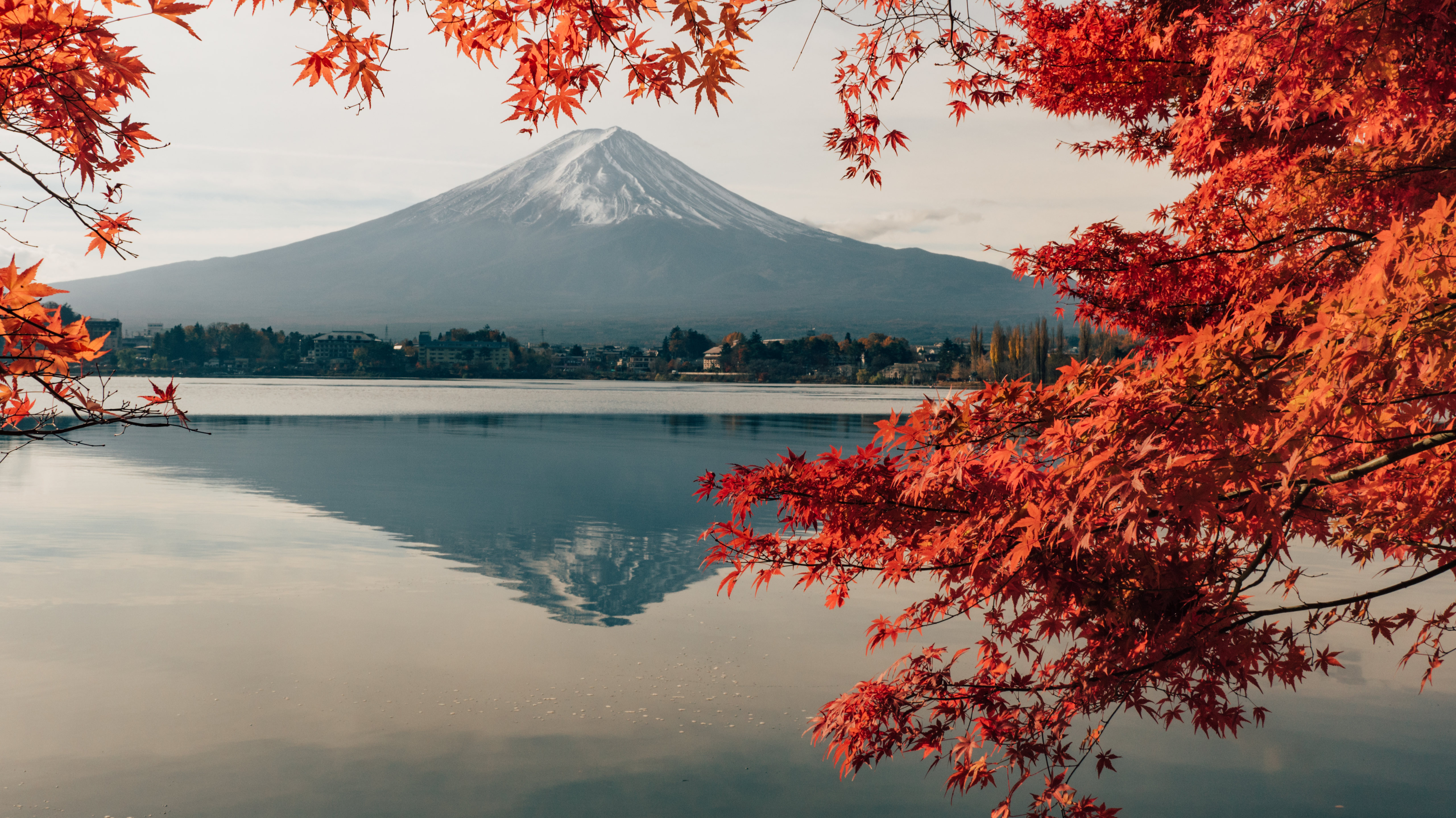 Mount Fuji, Autumn Leaves, Japan, Lake Kawaguchiko 5K Desktop and Mobile Wallpaper Background with a maximum resolution of 5120x2880 px.