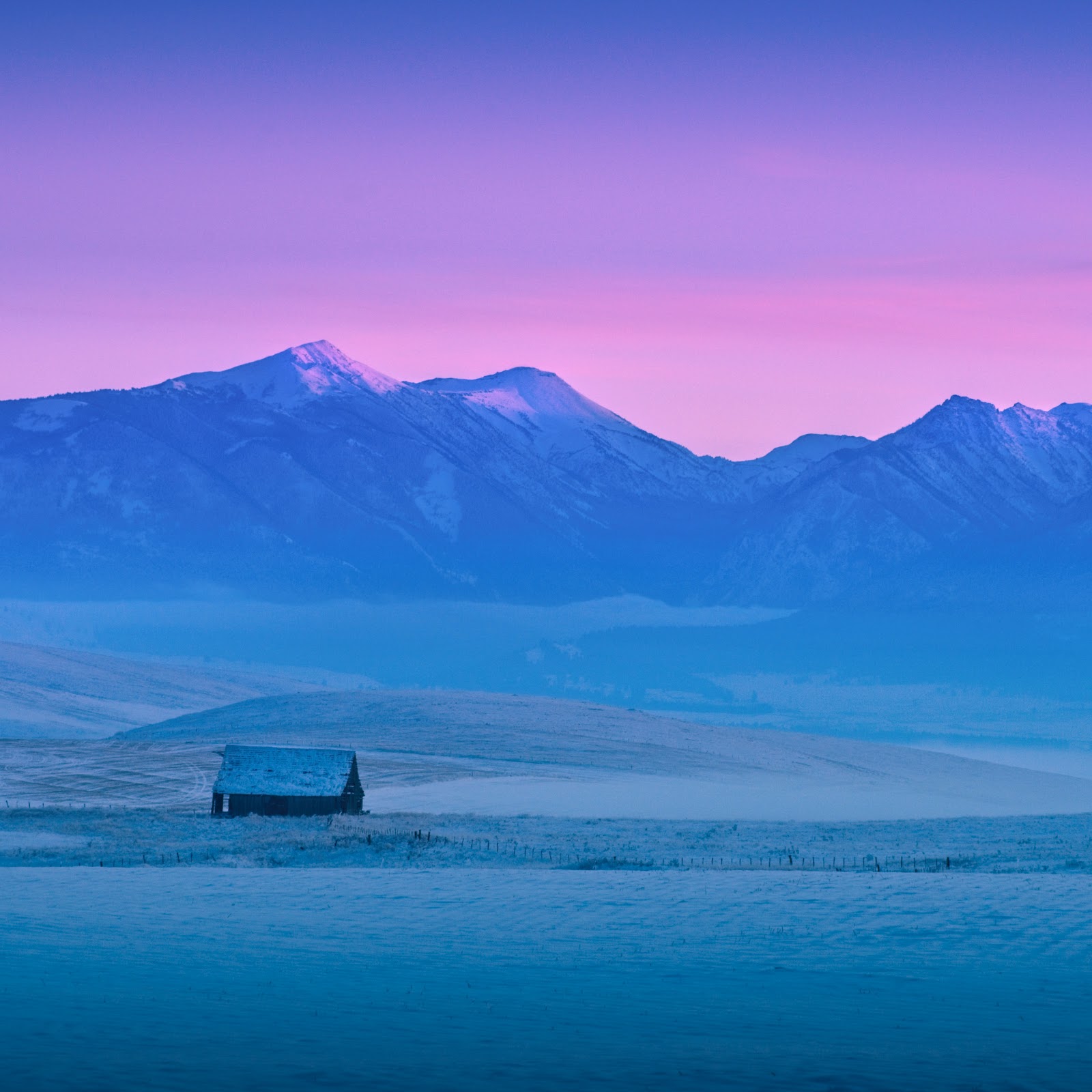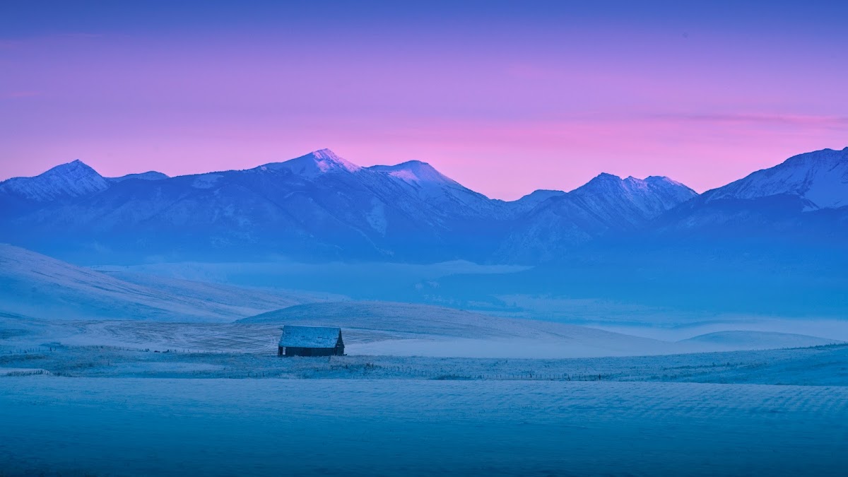 Mountain Landscape, Winter Scene, Sunrise Glow, Rural Setting 5K Desktop and Mobile Wallpaper Background with a maximum resolution of 5120x2880 px.