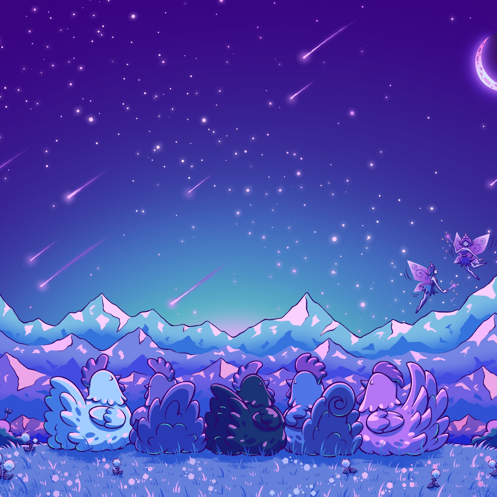 Night Sky, Starry Night, Chickens, Fantasy Art 4K Desktop and Mobile Wallpaper Background with a maximum resolution of 4869x2739 px.