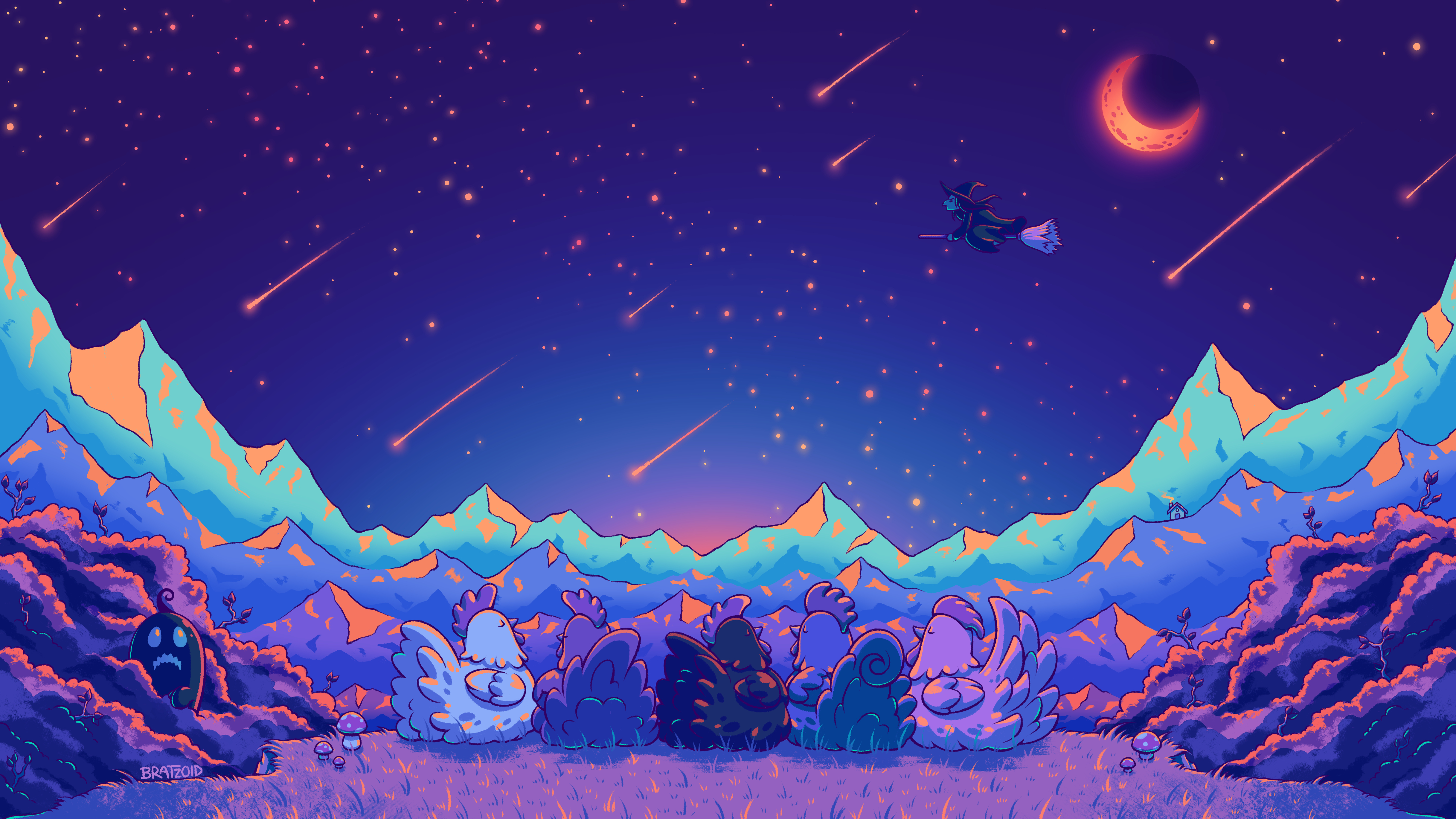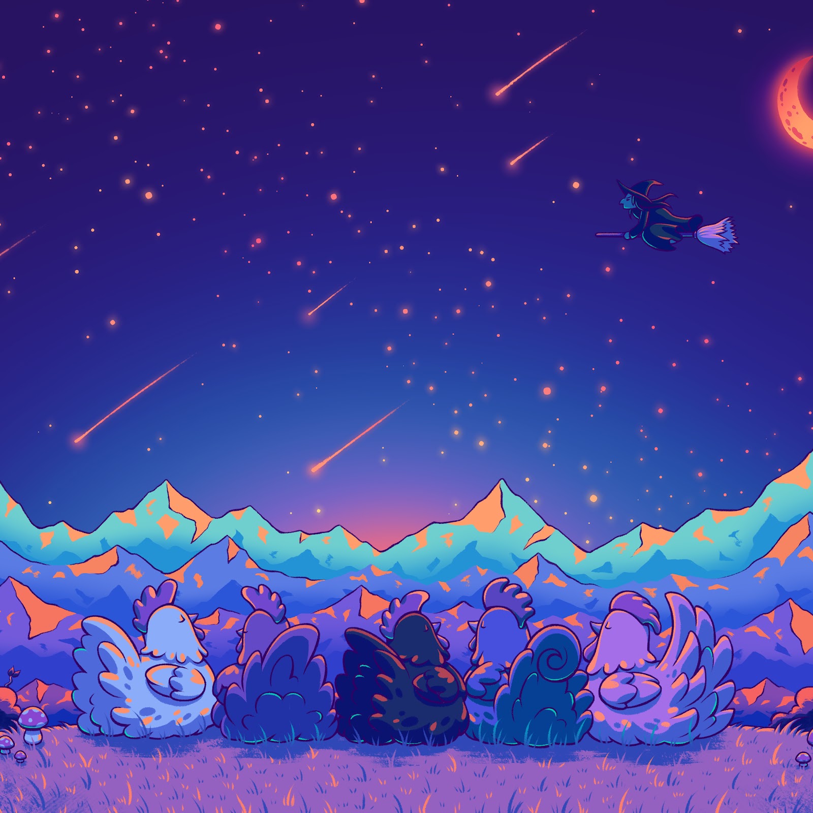 Night Sky, Witch, Cute Chickens, Falling Stars 4K Desktop and Mobile Wallpaper Background with a maximum resolution of 4869x2739 px.