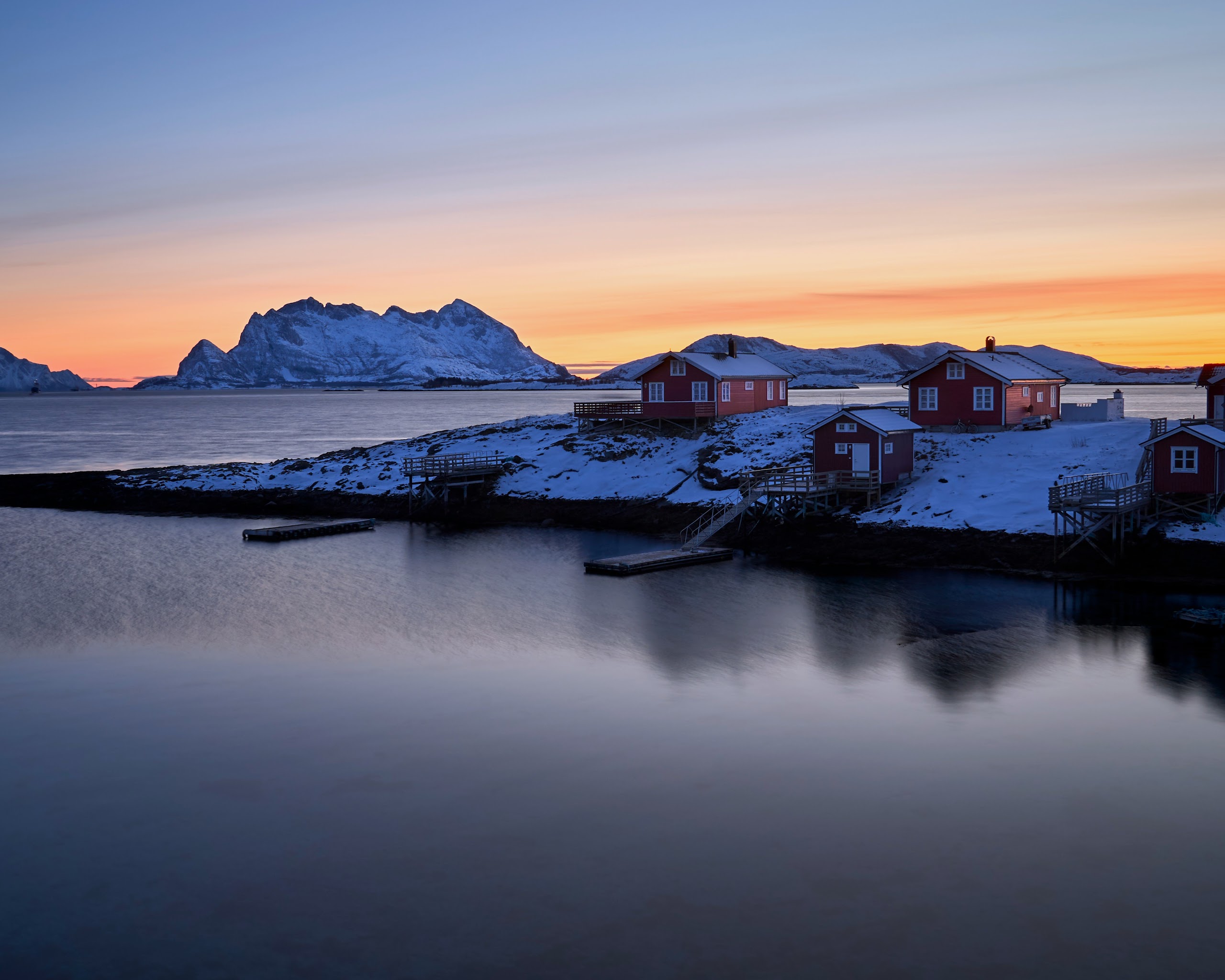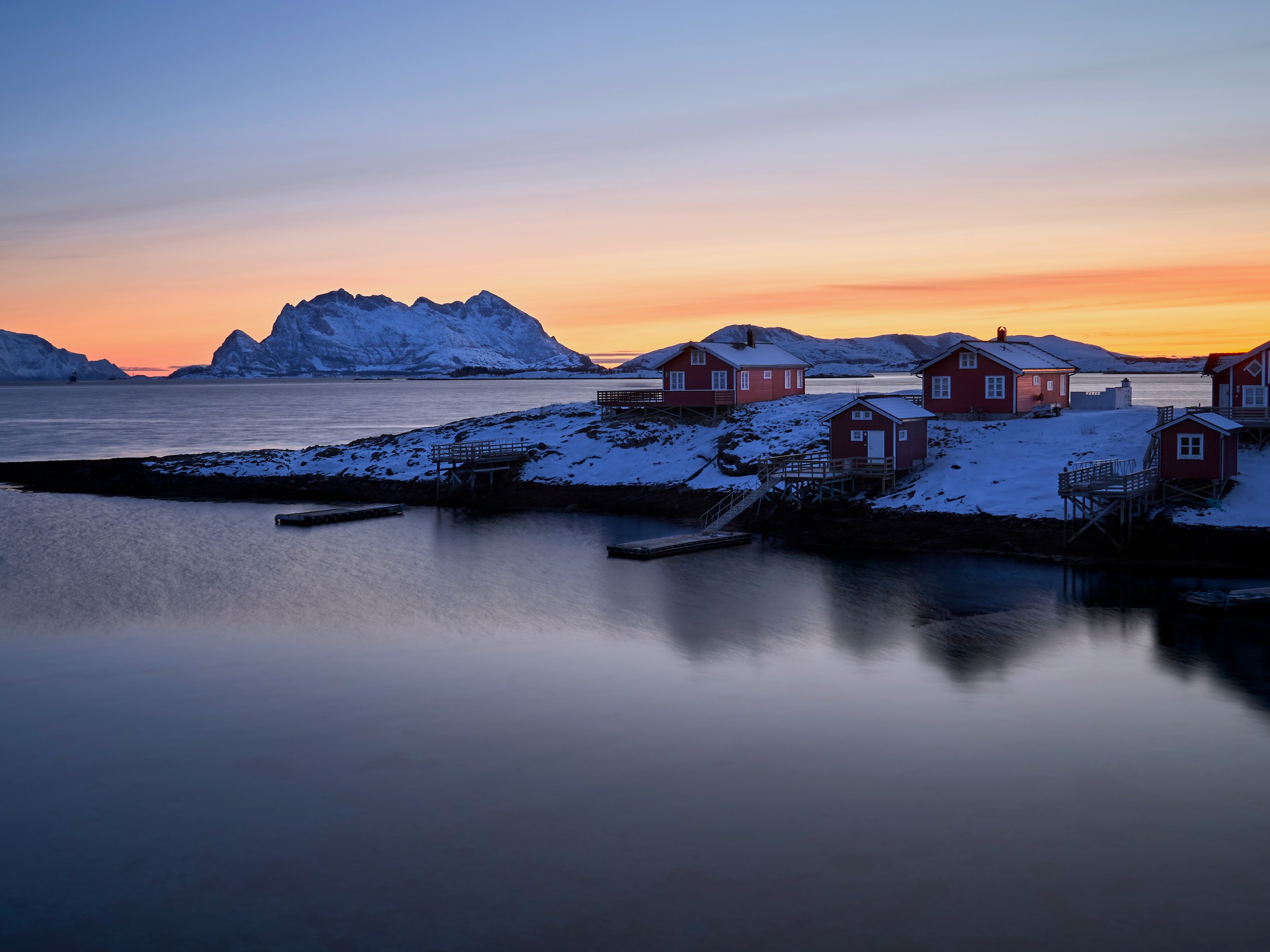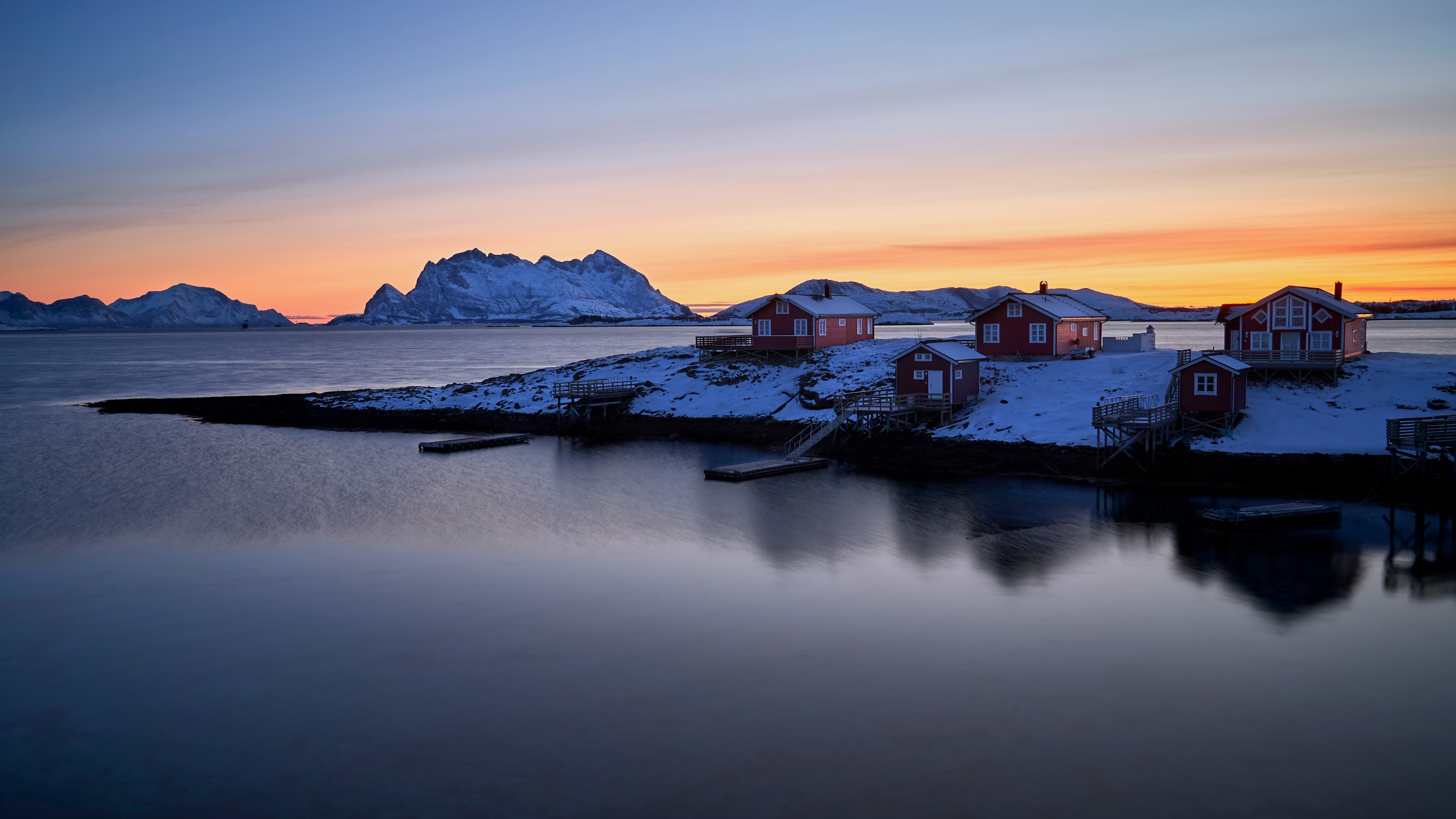 Norway Landscape, Winter Landscape, Arctic Landscape, Scandinavian Houses 5K Desktop and Mobile Wallpaper Background with a maximum resolution of 5120x2880 px.