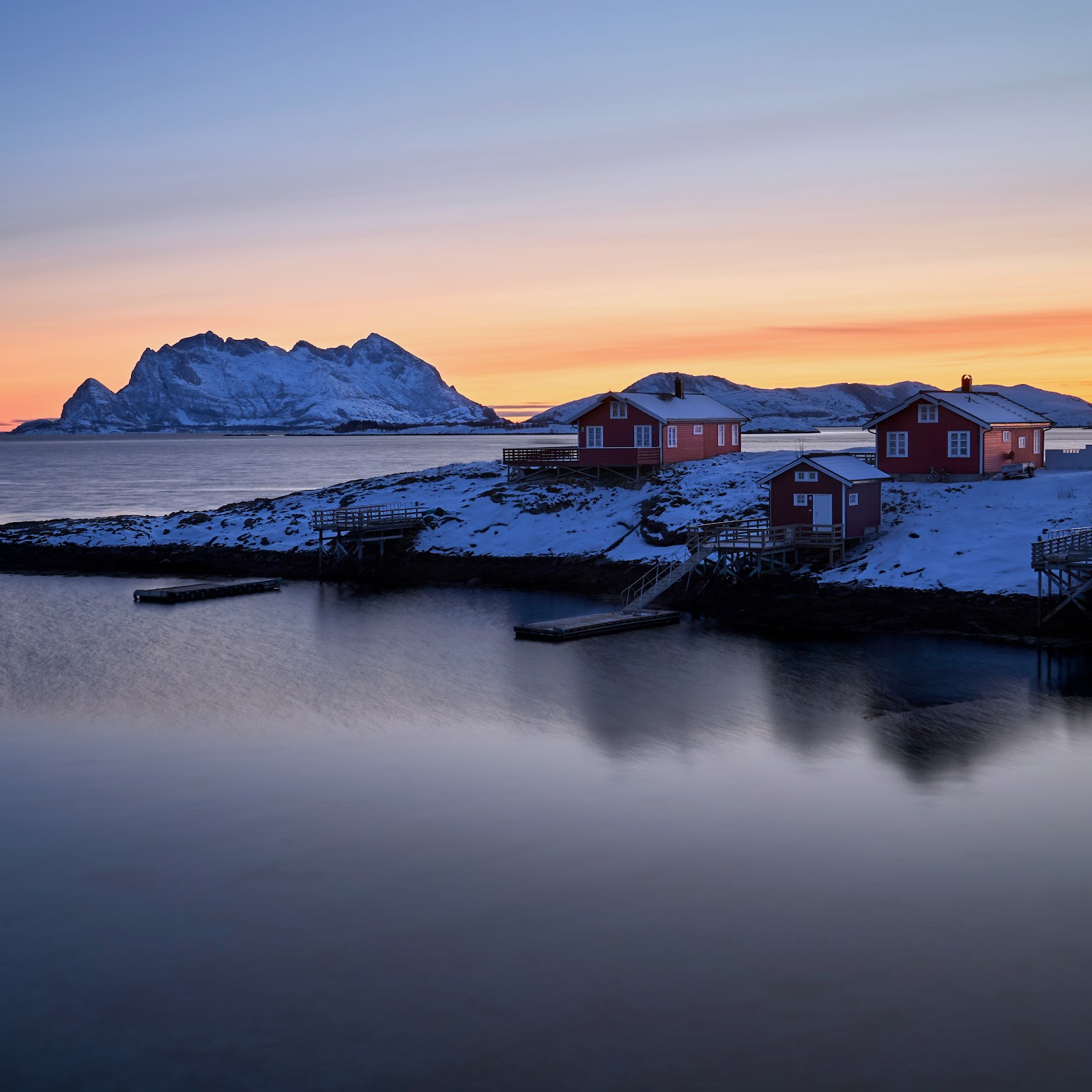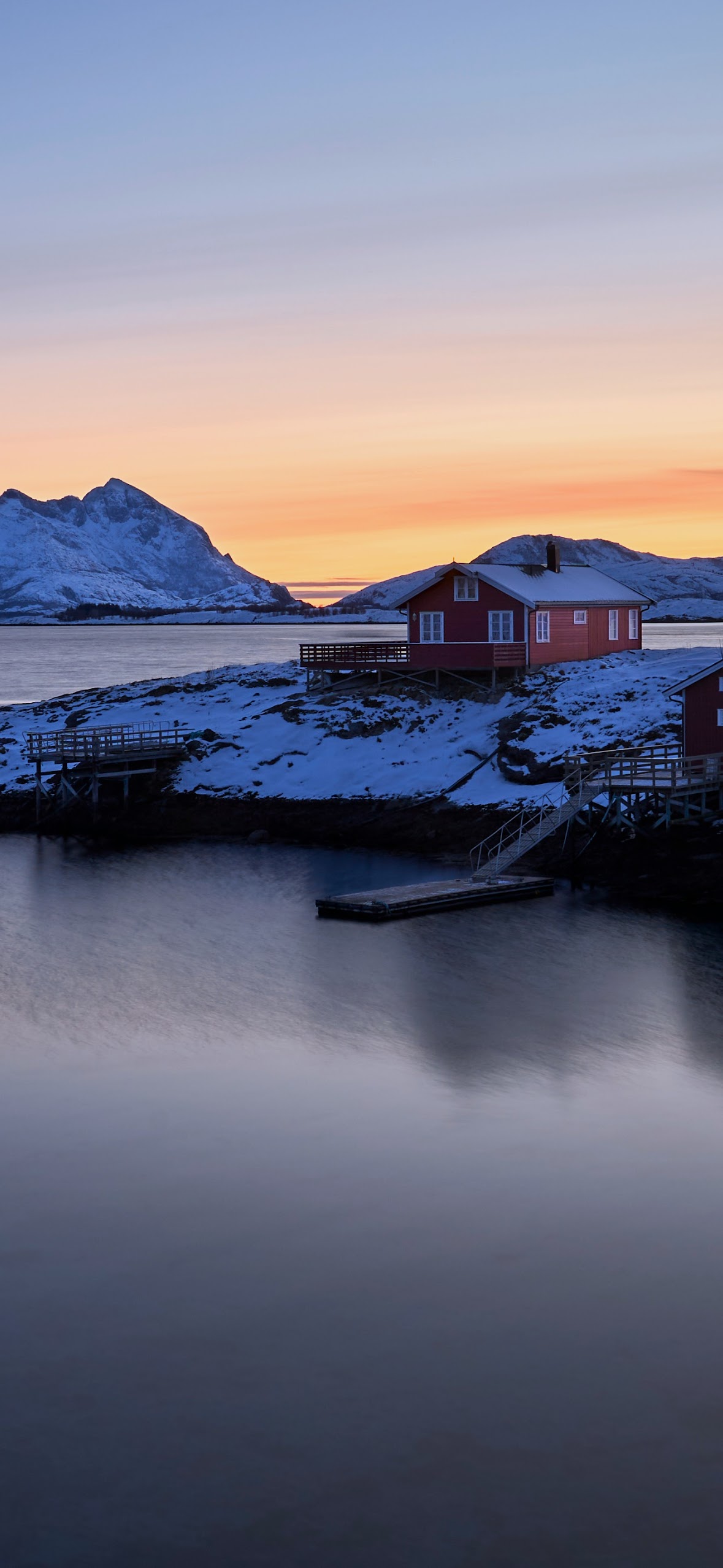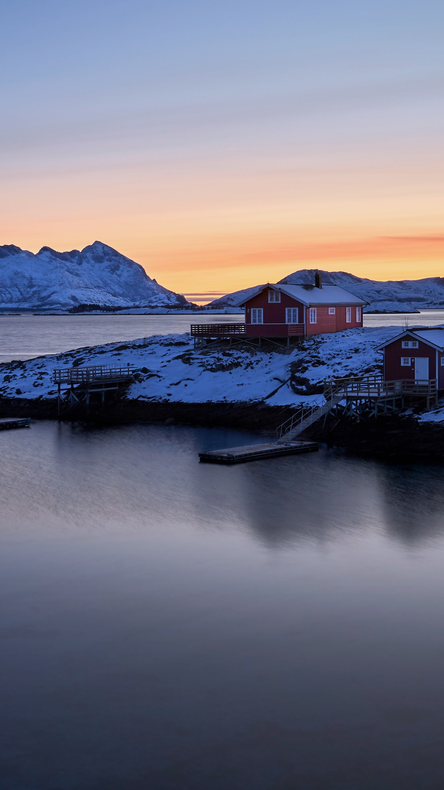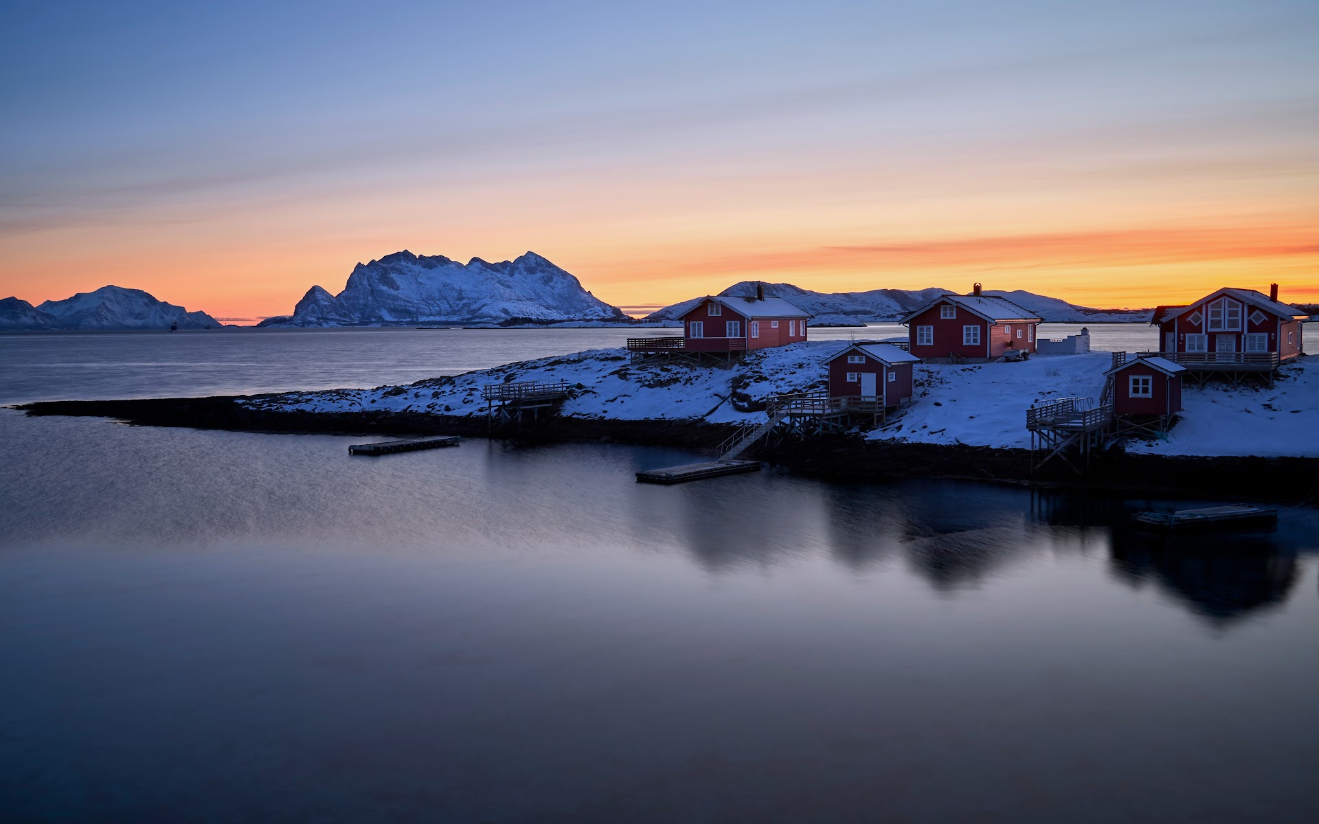 Norway Landscape, Winter Landscape, Arctic Landscape, Scandinavian Houses 5K Desktop and Mobile Wallpaper Background with a maximum resolution of 5120x2880 px.